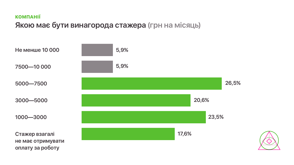 Відносно зарплати стажистів: 26,5% роботодавців вважає адекватною зарплату від 5000 до 7500 грн в місяць. Але цікаво, що значний відсоток представників компаній вважає взагалі недоречним фінансову винагороду для стажистів.
