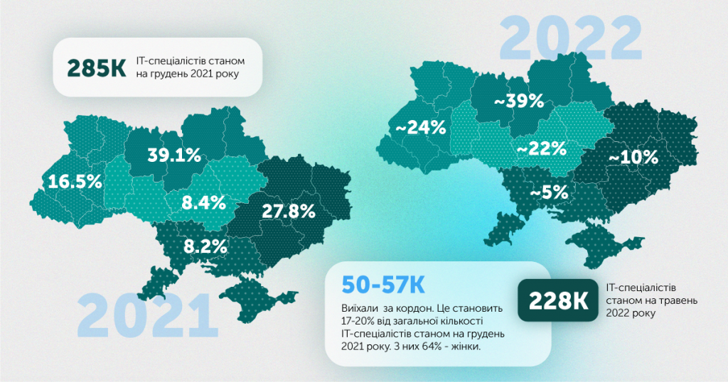 За даними IT Research Resilience, станом на травень-червень за кордон виїхало від 50 000 до 57 000 ІТ-спеціалістів. А приблизно 7 000 ІТ-спеціалістів стали до лав ЗСУ чи ТрО.