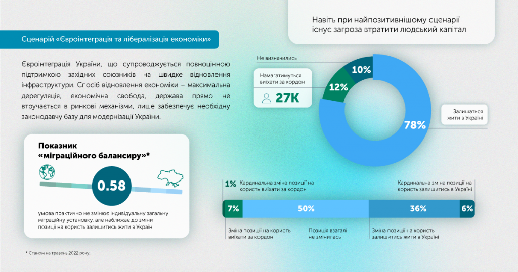 При реалізації позитивного сценарію, який передбачає євроінтеграцію та лібералізацію економіки, 78% опитаних залишаться в Україні, а 12% (орієнтовно 27 000 людей), намагатимуться виїхати за кордон.