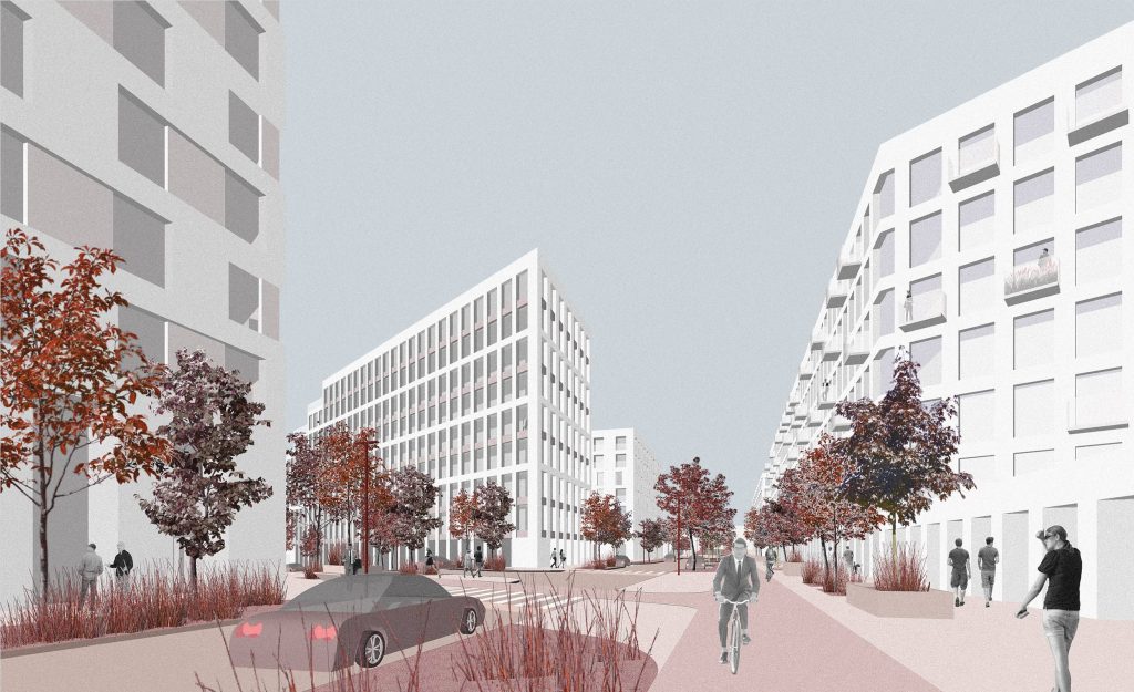 Протестувавши різні варіанти профілів вулиць і дворів у студії прийшли до мінімуму проїзної частини та великої кількості пішохідних добре озеленених зон уздовж вбудованих сервісів, а також велодоріжок.