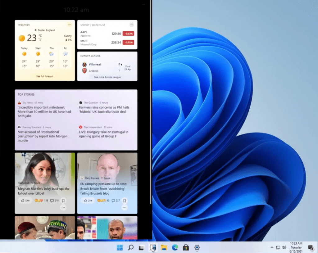 Візуально найбільші зміни можна знайти на панелі завдань: в центрі з’являться значки додатків, нова кнопка Віджети та меню «Пуск». Значки можна розміщати як в центрі, так і зліва.