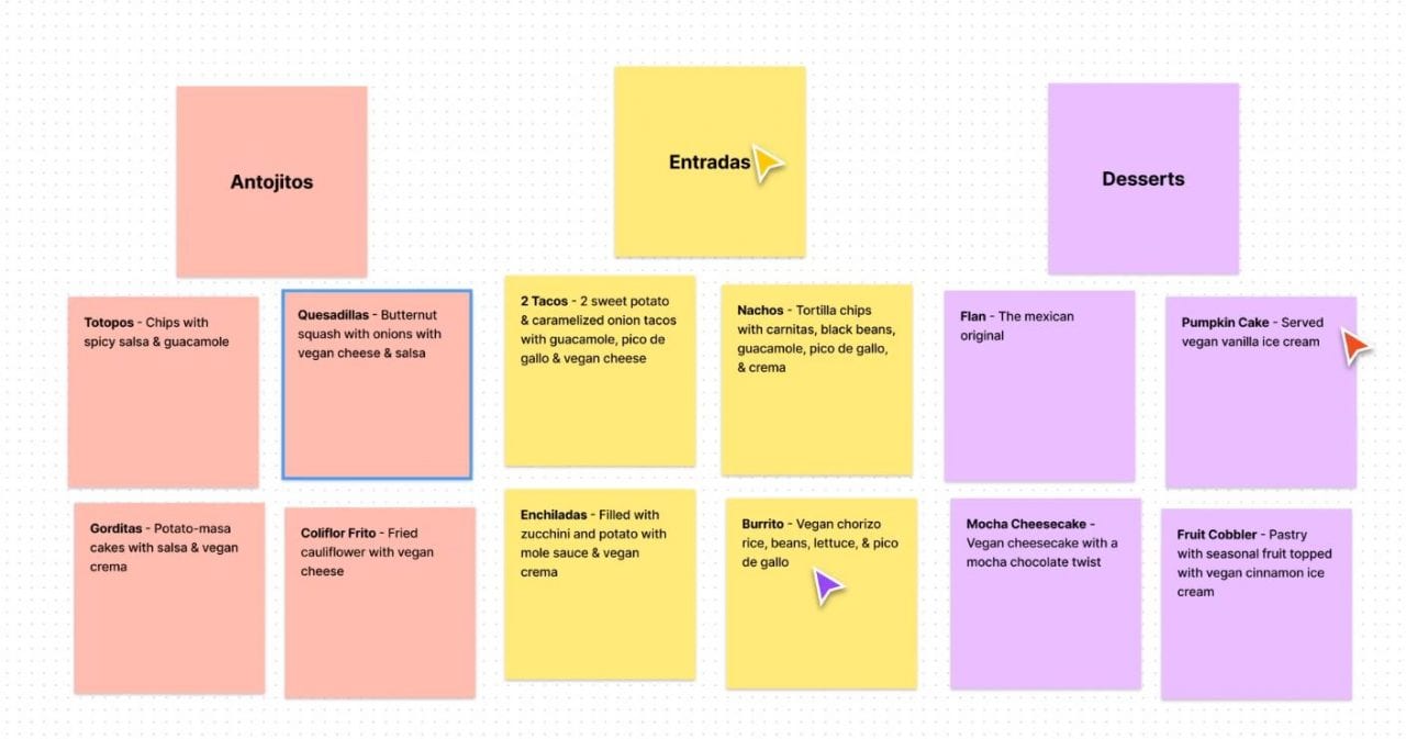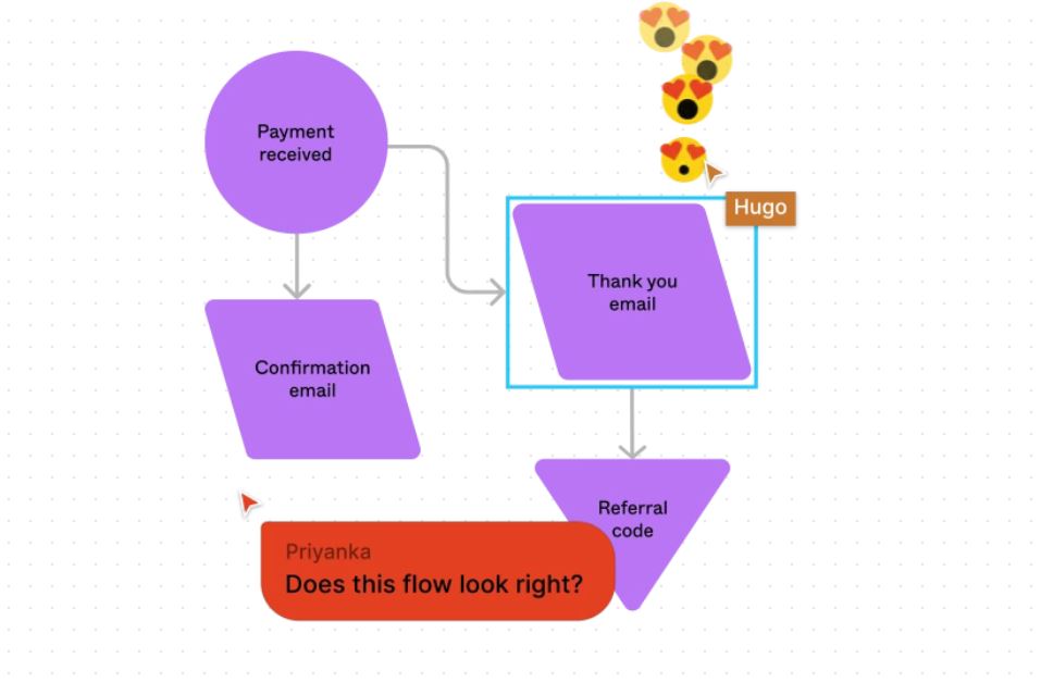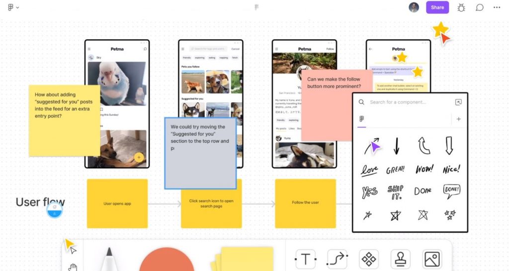 Інструмент дозволяє ділитися та обмінюватися ідеями зі своєю командою у FigJam: малювати маркером, використовувати наліпки, реагувати за допомогою емодзі, вставляти готові фігури, які прив’язуються до сітки, тощо.