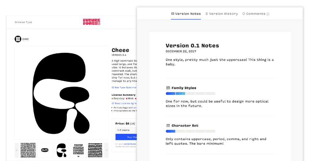В нем продаются только свежие экспериментальные шрифты, которые еще разрабатываются. Цена стартует с минимальной и повышается с выпуском каждой новой версии. Покупая любую из версий шрифта, будущие обновления пользователь получает бесплатно. Магазин не требует от авторов шрифтов их финализации, оставляя сообществу возможность финансово и морально поддержать их для завершения работы.