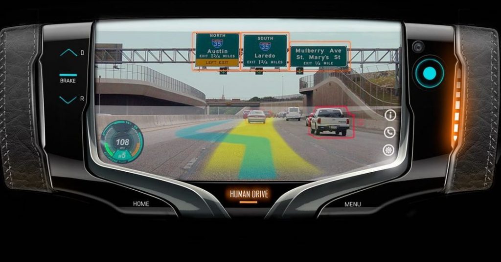 На кольоровий прямокутний сенсорний екран виводитися зображення з фронтальної камери з технологією доповненої реальності. Водій може зосередитися на кермі, а система безпеки зможе підстрахувати: коли автомобіль переходить в автономний режим, на екрані з’являється інформація з датчиків та інформаційно-розважальної системи. Коли водій керує самостійно, екран повертається з фронтальної камери до прямої трансляції.