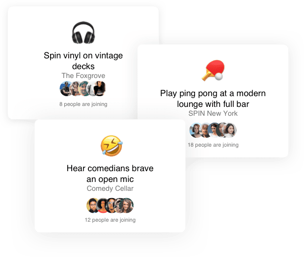 Мережа обіцяє з’єднувати з людьми, у яких схожі інтереси. Наприклад, такі як спорт, або відвідування івентів. Користувач може створити список івентів або активностей, в яких він в даний час бере участь, і запросити друзів або незнайомців приєднатися до нього.