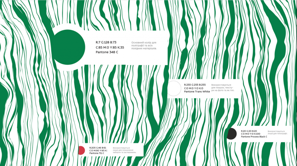 Образ логотипу поєднується з позитивним та інформативним голосом бренду, репрезентуючи ліси, ландшафти, водойми та наголошує дотримуватись відповідної культури поведінки.