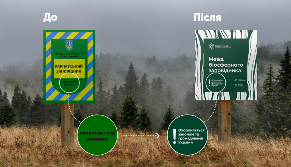 Знак «охороняється законом» змінюється на «Охороняється законом та громадянами України». Це зроблено для залучення особистої відповідальності відвідувача та його самоідентифікації як частини громадянського суспільства.