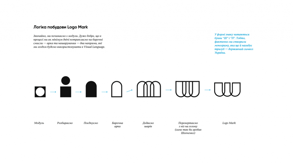 За основу айдентики команда дизайнерів взяла круглу рамку, в якій зазвичай зображений портрет Тараса Шевченка. На її основі дизайнери зможуть створювати нескінченну кількість варіантів дизайну. До рамки додали стилю бароко та перевернули знак, який отримали. Таким чином розробили логотип. У ньому більшість бачить літери Ш і П, хтось — зв’язок із гербом, хтось — келихи шампанського, інколи навіть фалічні символи.