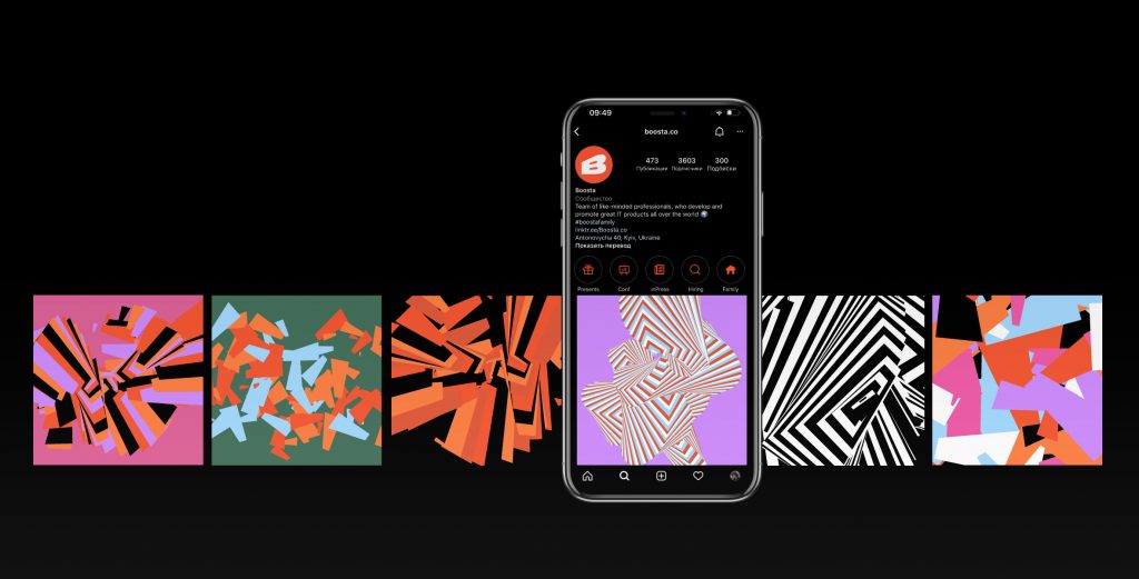 Тепер у Boosta більше мільйона різних патернів, які можна легко створити лише в кілька кліків. На платформі генерування необхідно налаштувати величину фігур, їхню кількість і відстань між ними, бажані кольори, фон та провести стрілкою по екрану. Усе – новий унікальний патерн готовий!