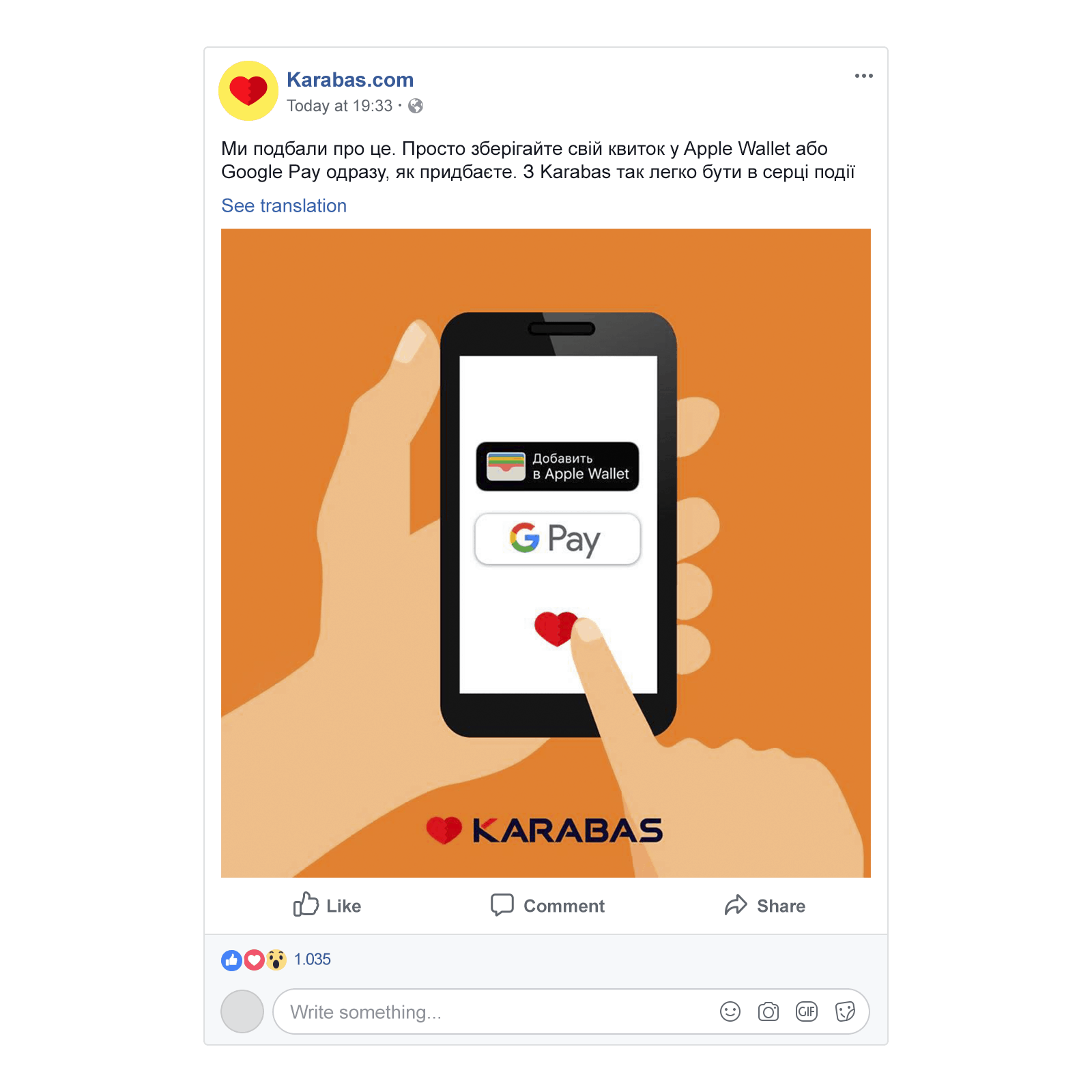 «Кожен квиток Karabas переносить нас у сердце подій. Мільйони сердець б’ються швидше, разом ми помножуємо любов. Коли ми єдині — любові стає більш», — пояснює команда.