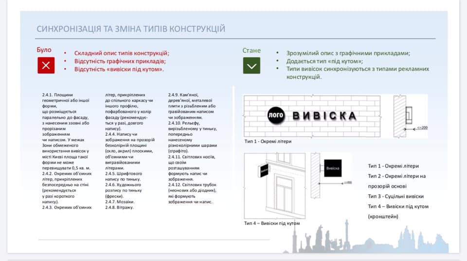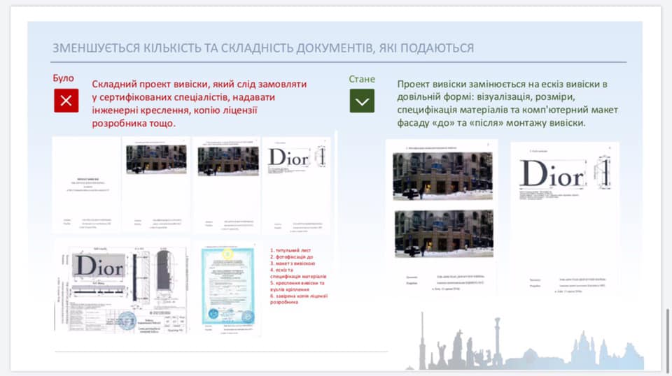 «Зараз підприємцям потрібен проєкт вивіски, що слід замовляти у сертифікованих спеціалістів, надавати інженерні креслення, копію ліцензії розробника тощо. Зі змінами передбачаємо проєкт вивіски замінити на ЕСКІЗ вивіски, який буде подаватися в довільній формі: візуалізація, розміри, специфікація матеріалів та комп’ютерний макет фасаду «до/після» монтажу вивіски», — пояснює начальник Управління з питань реклами Олександр Смирнов.