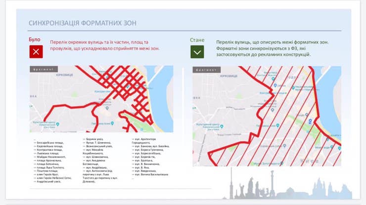 Зараз це перелік окремих вулиць та їх частин, площ та провулків, що дуже ускладнює візуальне сприйняття. Київрада пропонує спростити перелік вулиць, які будуть описувати межі форматних зон.