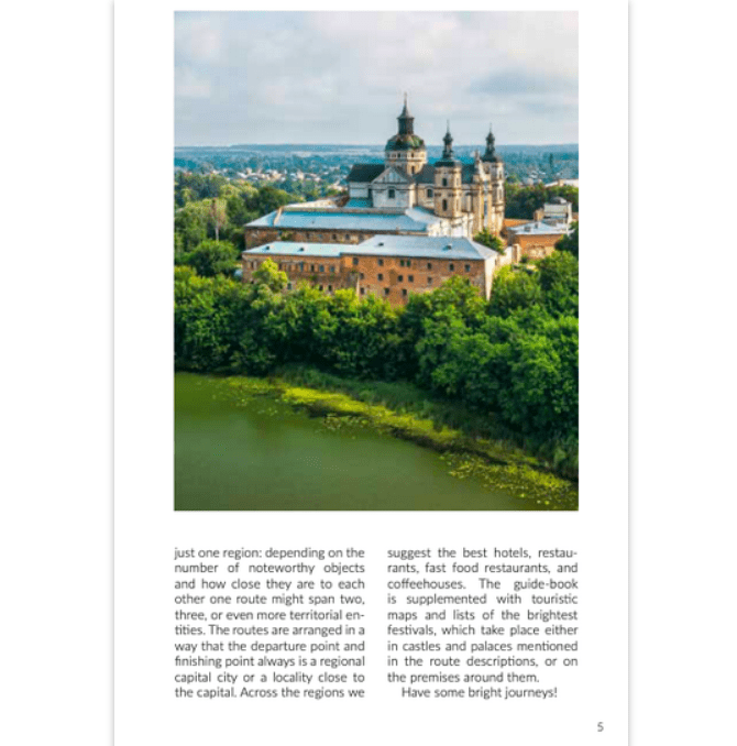 Путівник складається зі 192 сторінок з ілюстраціями, адресами, культурою й історіями найцікавіших та незвичайних замків і палаців України. Це не тільки найпопулярніші місця, але й маловідомі. В путівнику також є список готелів і ресторанів, а ще довідкова інформація та карти екскурсійних маршрутів.