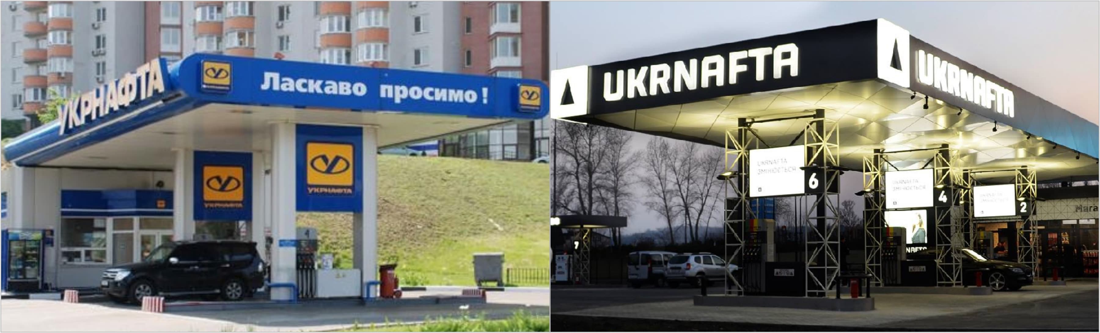 АЗС «Укрнафта» старого зразка (ліворуч) та нового зразка (праворуч).