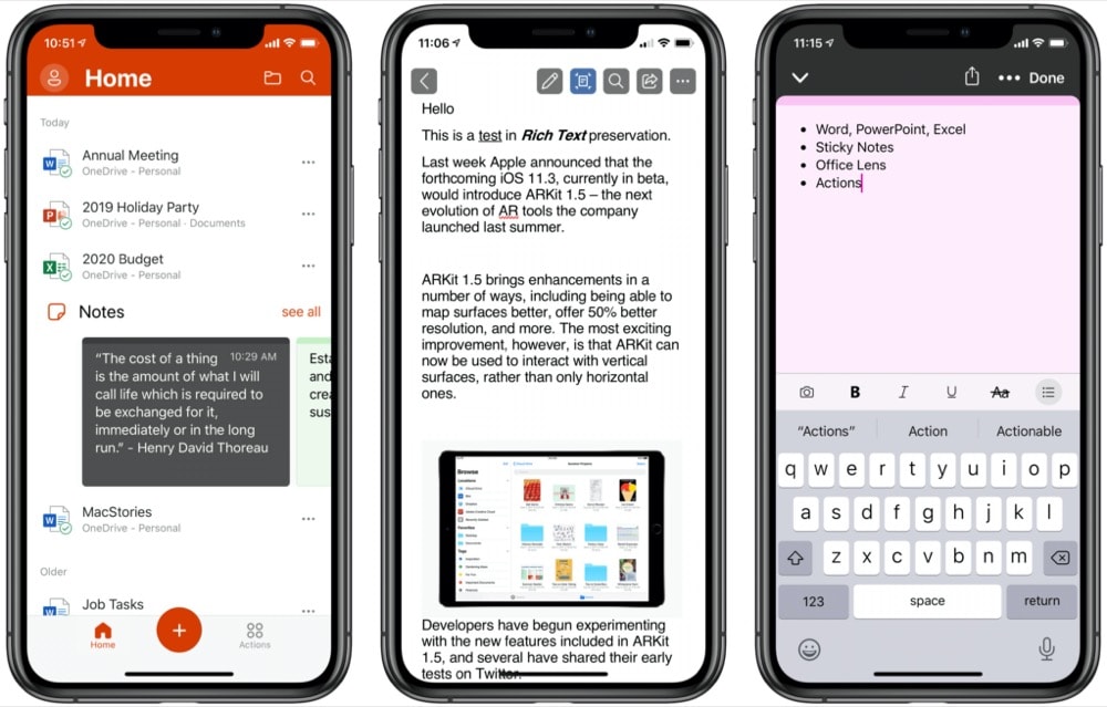 У додатку можна створювати швидкі замітки (Sticky Notes) — вони розміщуються на головній сторінці. Завдяки камері Office Lens можна сканувати документи і дошки, текст на них буде доступний для пошуку. Також Lens дозволяє передавати документи з комп’ютера на смартфон з QR-кодом (для цього потрібно відкрити з робочого столу адресу aka.ms і просканувати зображення).