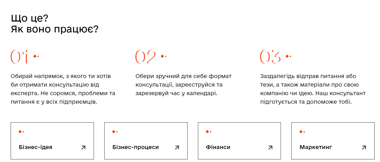 З часом на сайті будуть доступні консультації для підприємців. Можна буде за допомогою відеозв’язку отримати онлайн-консультацію із фахівцями щодо бізнес-процесів, фінансового управління, взаємодії з державою тощо.