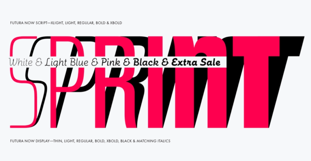 Сімейство Futura Now доступне у вигляді набору стандартних шрифтів OpenType та в трендовому варіативному форматі.