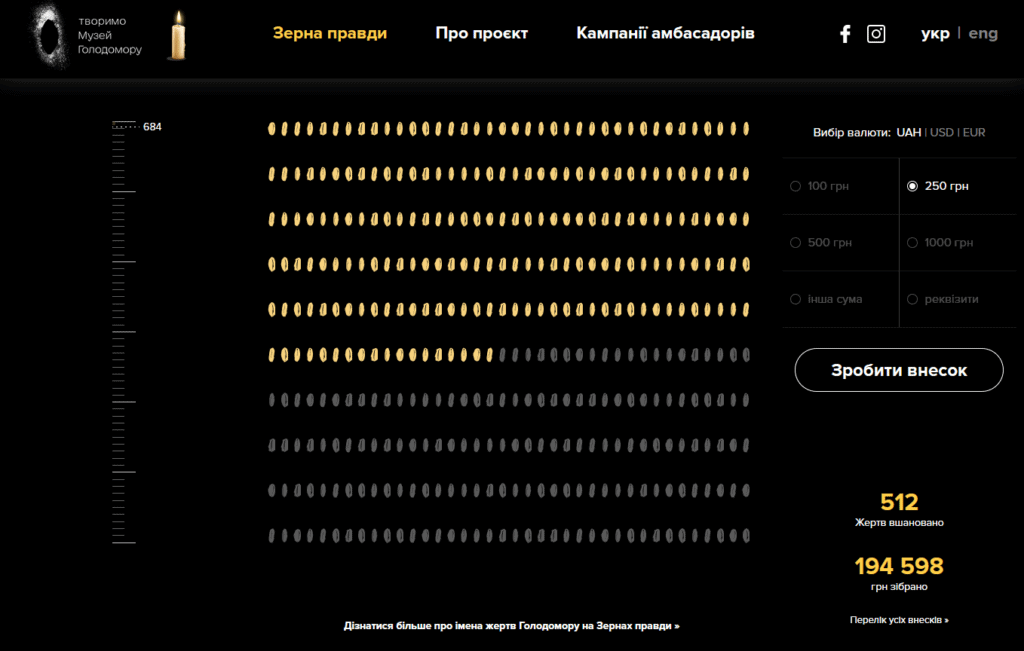 На чорному трафареті зображені зерна. Коли людина жертвує гроші, зерна стають кольоровими й при натисканні випливає інформація про одного із загиблих зі списку мартирологу, складеного 10 років тому. Можна створити й власний відбиток зерна і завантажити його на платформу.
