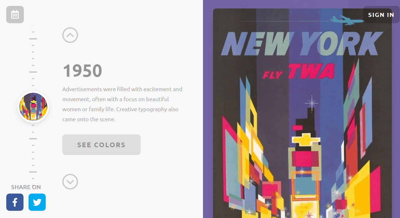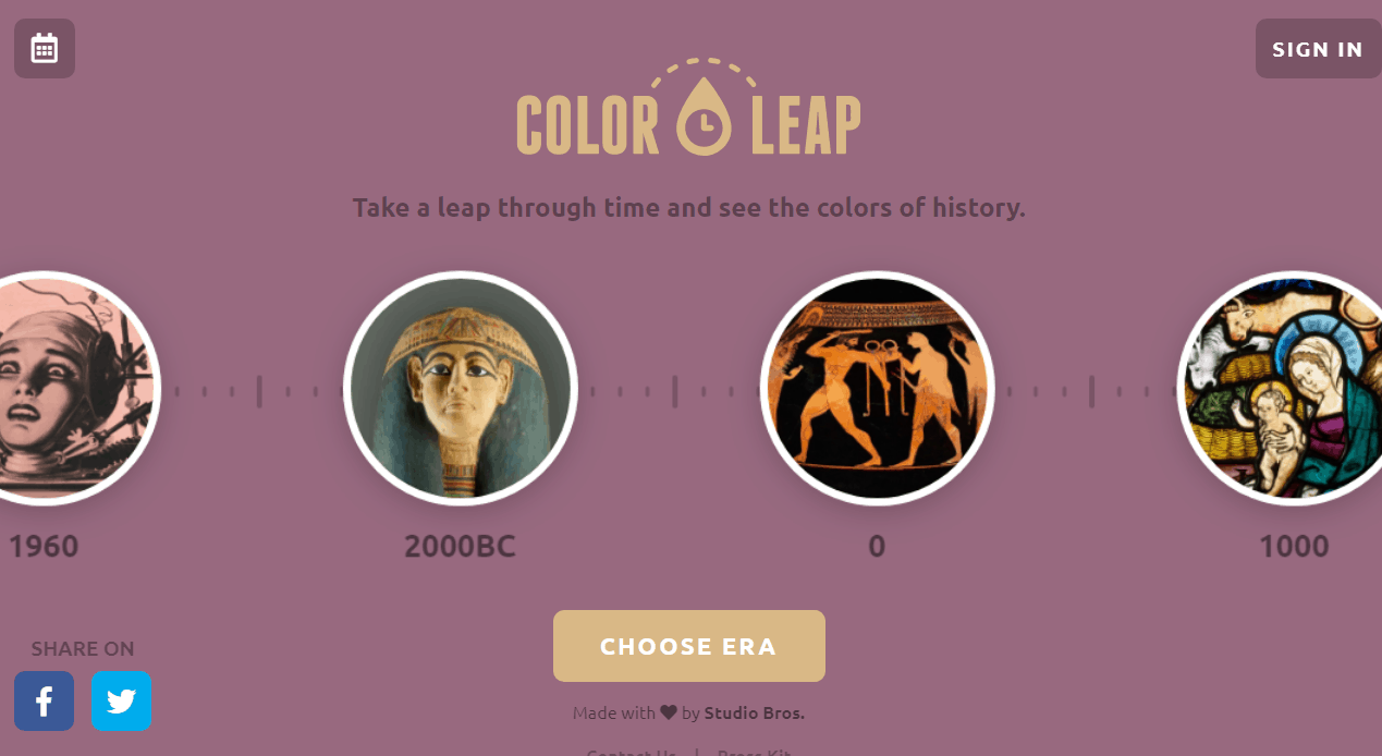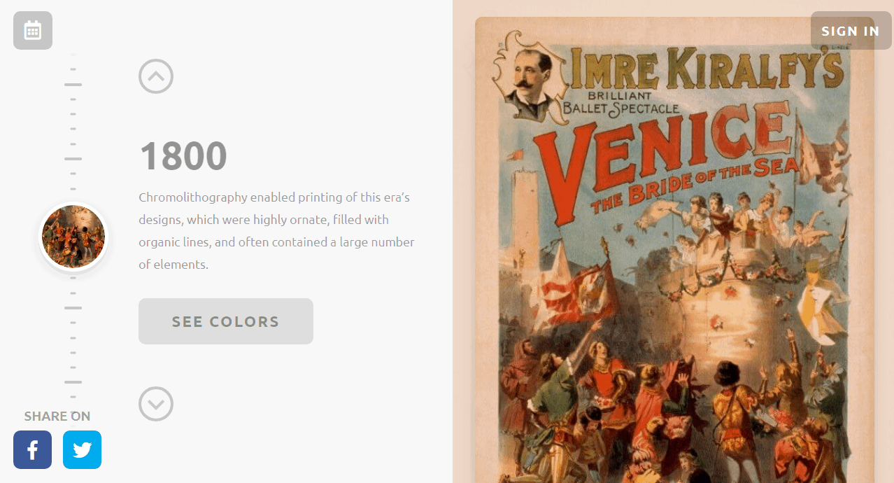 Колекція складається з 180 палітр. В ній представлені кольори, що використовувалися протягом 12 різних епох в історії – загалом це 4000 років. Кожна палітра була створена шляхом вибірки творів мистецтва з певного періоду. Тут також можна подивитися короткий опис кожної епохи. Вибір епох закінчується на 60-х роках минулого століття, оскільки після цього періоду складно знайти культові зображення, які не обмежені у використанні авторськими правами.
