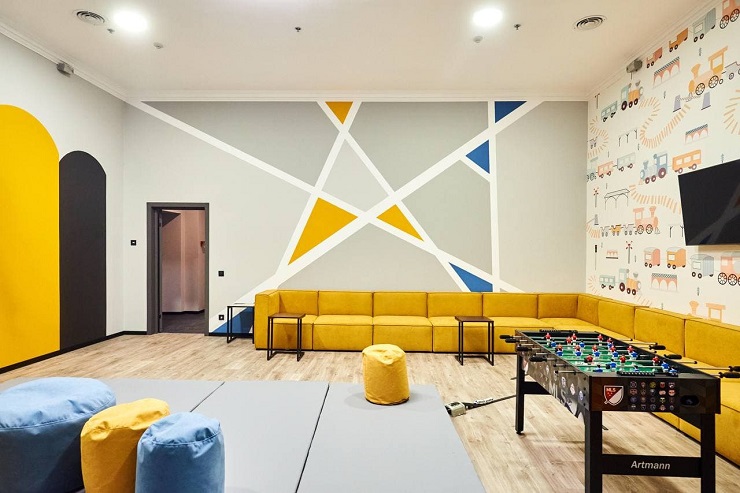 Також тут є велика дитяча кімната з м’якою ігровою поверхнею, вбиральня зі сповивальним столиком та дитяче меню.