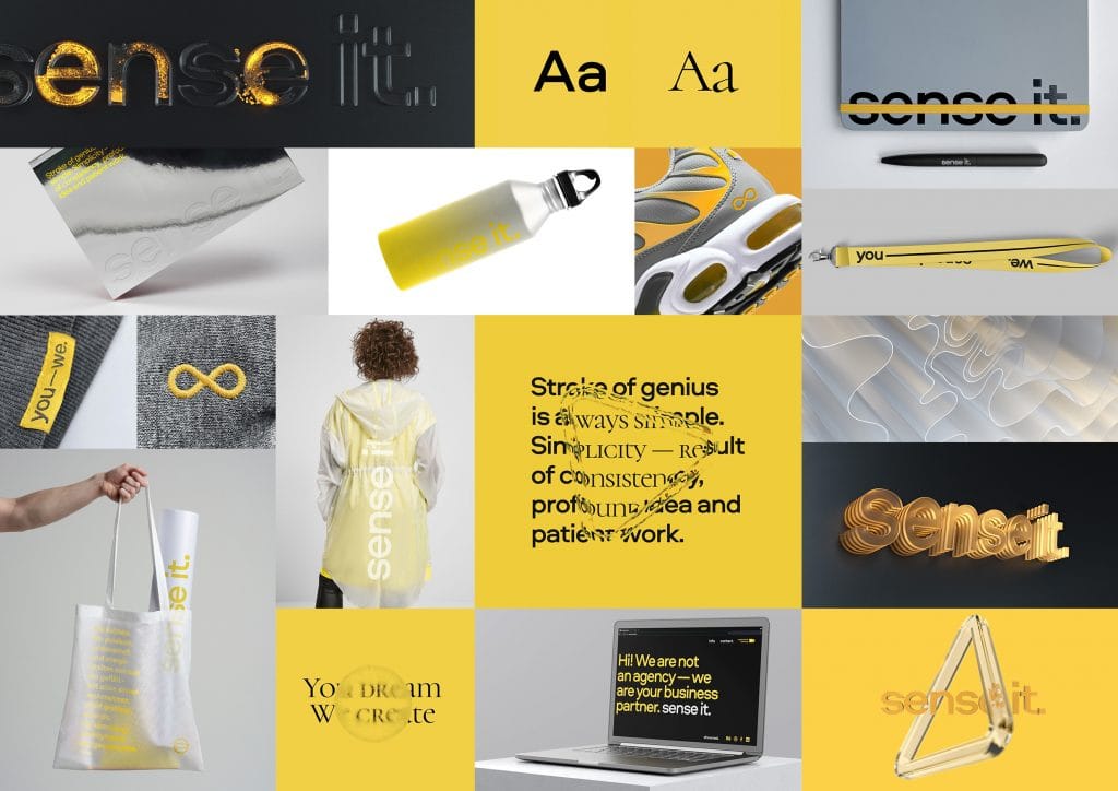 6) Sense it з проєктом айдентики власної компанії. Sense it – це консалтингова компанія, що пропонує послуги з розробки дизайну, досліджень та маркетингу. Оскільки агенція займається розробкою цифрових, тобто нематеріальних продуктів, її айдентика звертається до її назви «відчути це».