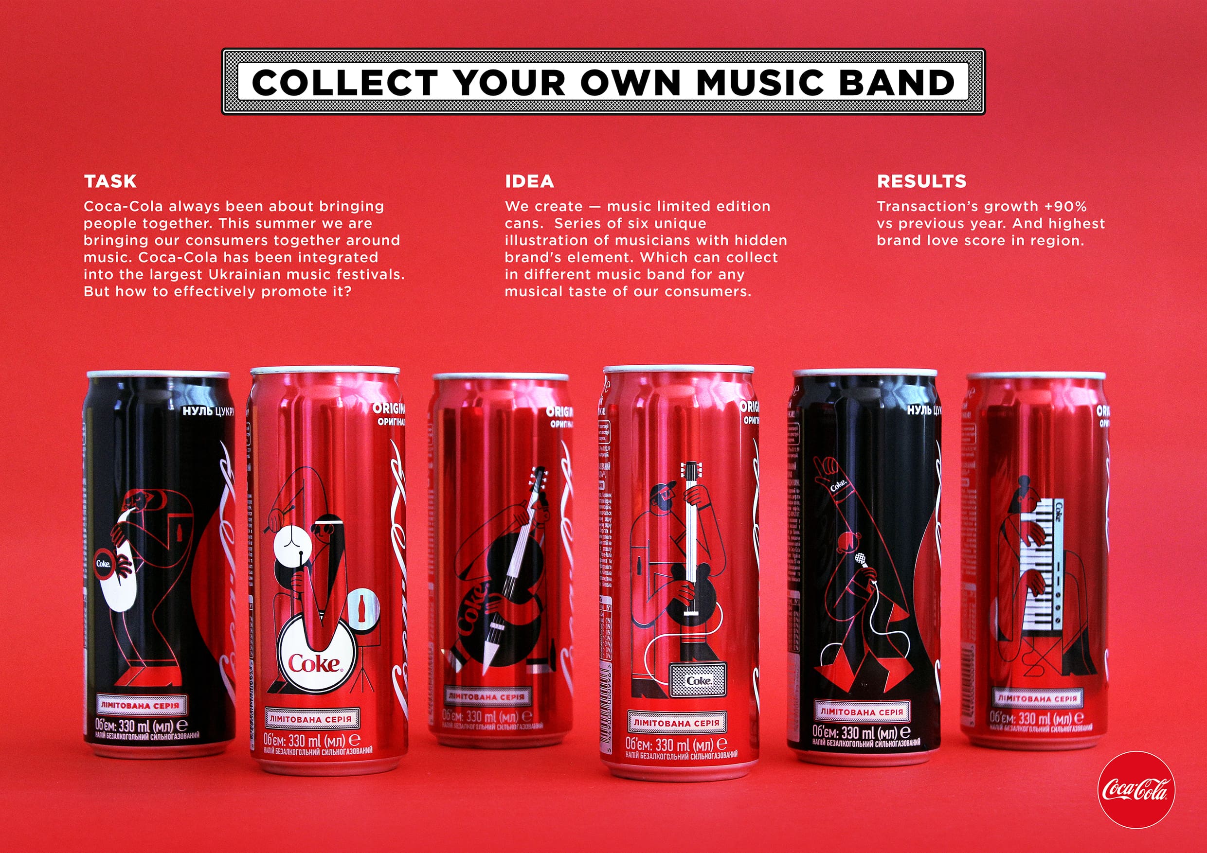 2) Юрій Шипота та Таня Якунова з проєктом COLLECT YOUR OWN MUSIC BAND Створив серію з шести унікальних ілюстрацій музикантів з прихованим елементом бренду. Ця ж робота отримала нагороду у категорії Illustration & Photography.