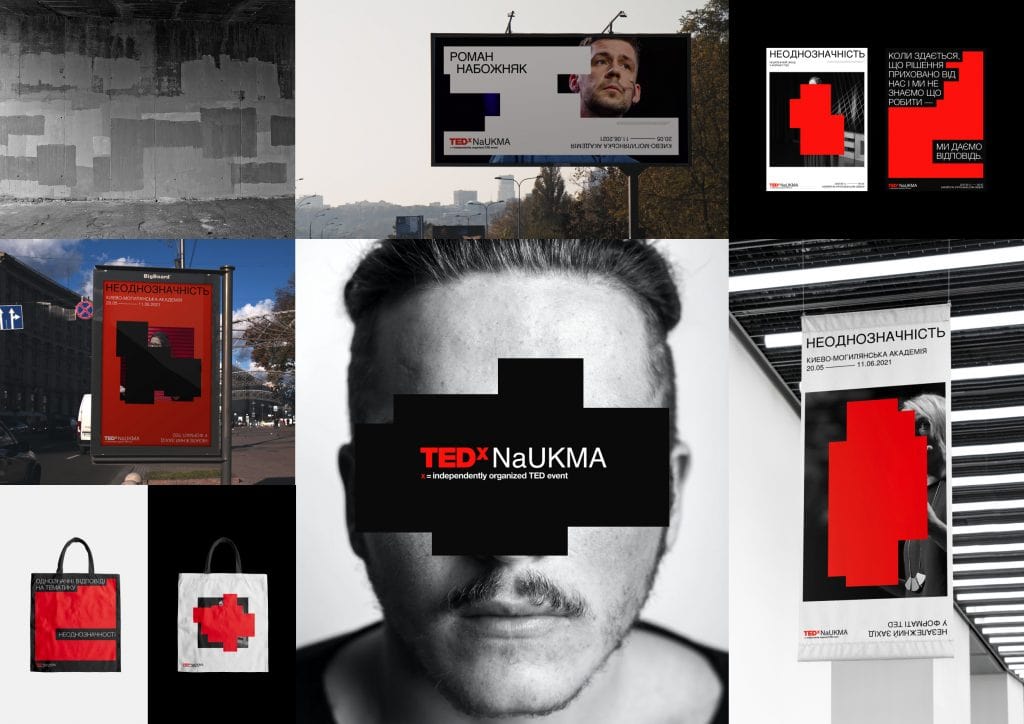 4) Hexagon Agency з проєктом айдентики TEDxNaUKMA – незалежної конференції ідей: пов’язали «двозначність» з абстрактною, стислою формою і порівняли тему з явищем видалення графіті – процесом, який, приховує старе та створює нові почуття.