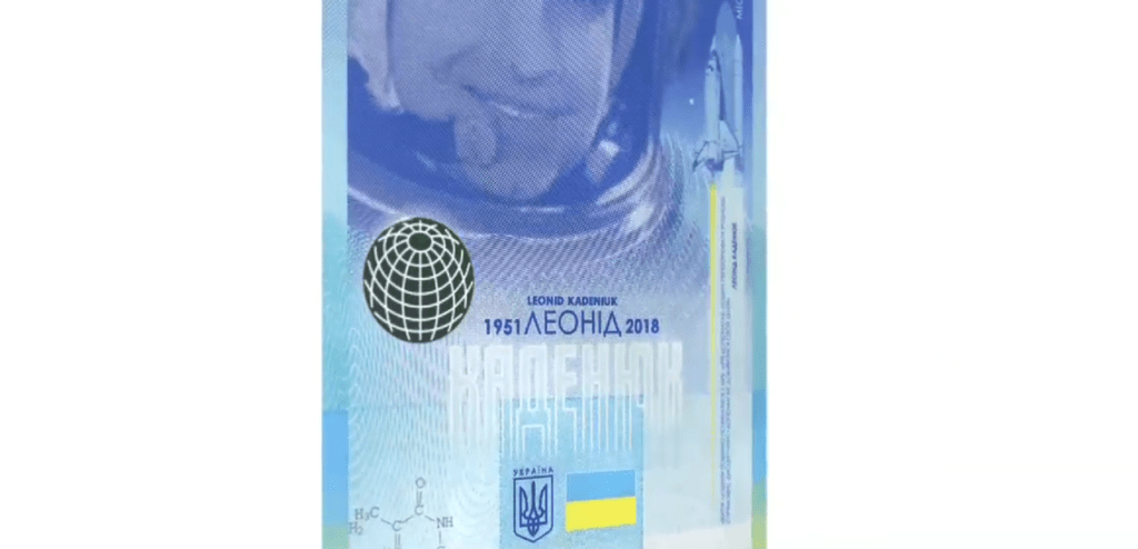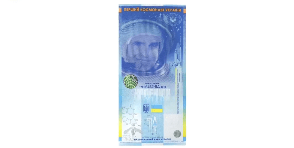 На лицевому боці зображено портрет Леоніда Каденюка. Зверху напис: «Перший космонавт України». Праворуч – логотип Державної космічної агенції.