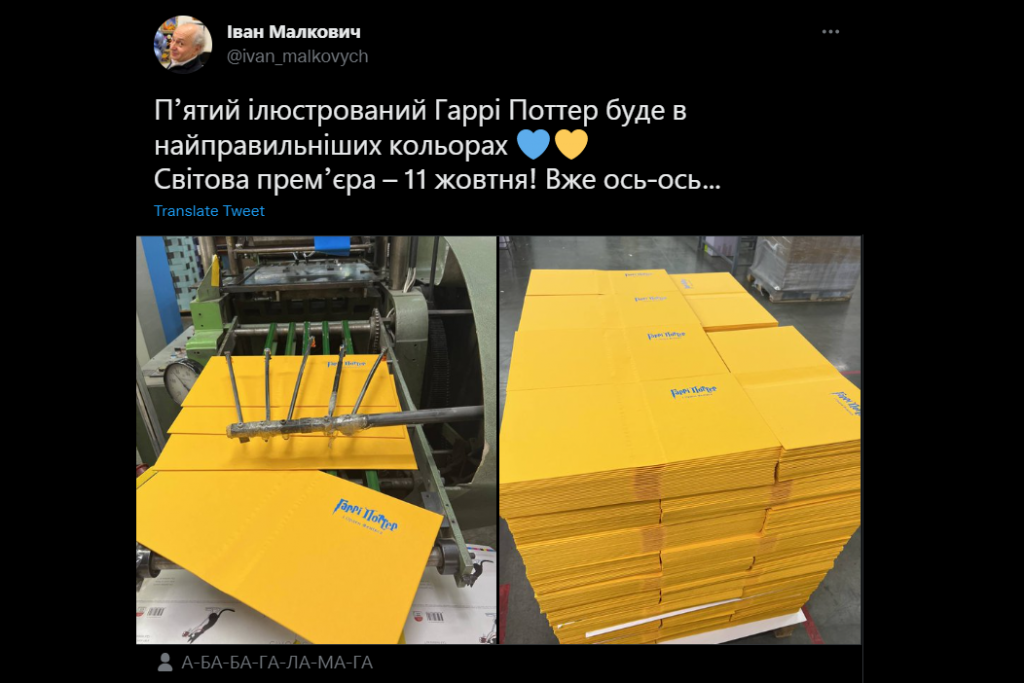 «Пʼятий ілюстрований Гаррі Поттер буде в найправильніших кольорах. Світова прем’єра — 11 жовтня! Вже ось-ось…» — заявив главред видання «А-БА-БА-ГА-ЛА-МА-ГА» Іван Малкович.