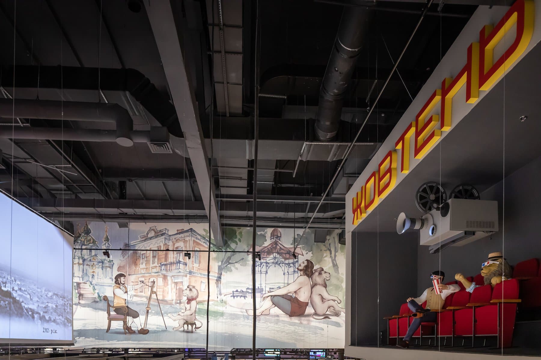 Зала поділена на частини: глядацьку, виставкову та торгову. У глядацькій частині герої Самсон та Лев дивляться кіно, а на екрані показують 17-хвилинне відео про Поділ минулих часів і кадри з історії самого Жовтня. Рідкісні архівні матеріали допомагали збирати працівники Центрального державного кінофотофоноархіву імені Г.С. Пшеничного.