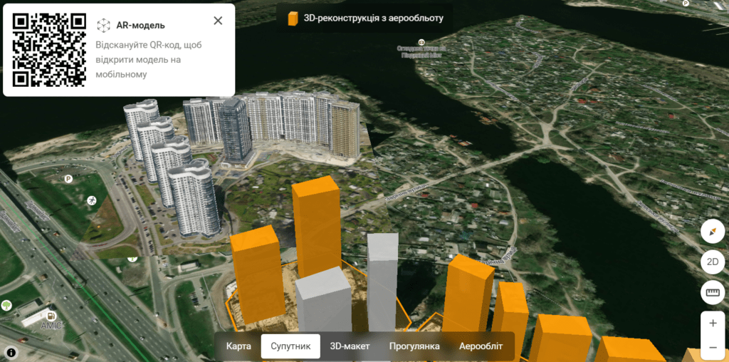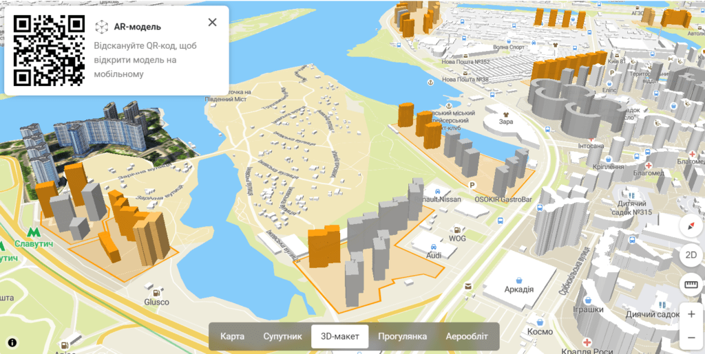 На карті з’явився 3D макет із зображеннями об’ємних новобудов, що знаходяться у процесі будівництва. У цьому режимі можна також відкрити AR-модель.