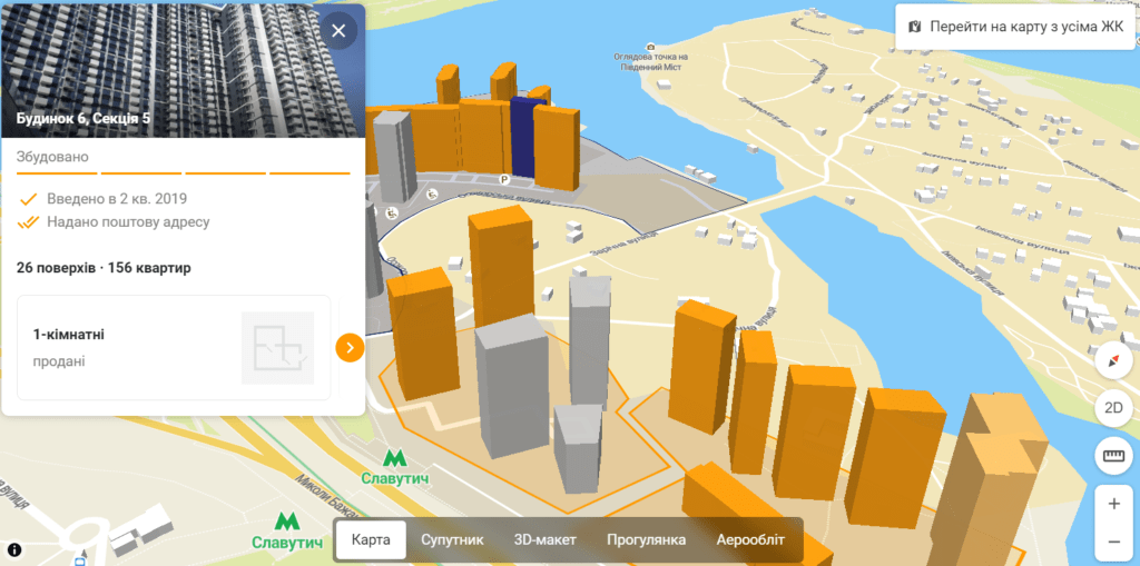 На карті тепер можна обрати будинок з повною інформацією про нього: актуальний статус будівництва, ціни та планування. В цьому режимі доступний об’ємний генплан, на якому можна обрати кожен окремий будинок.