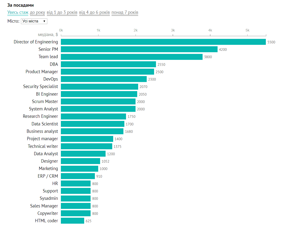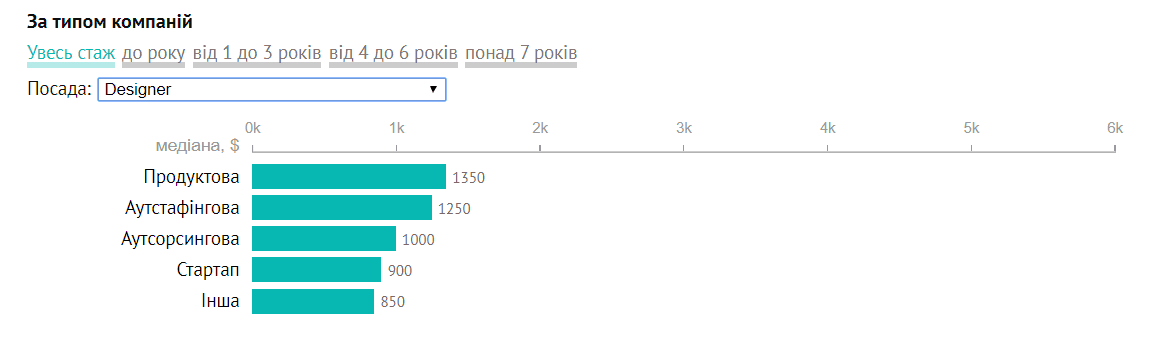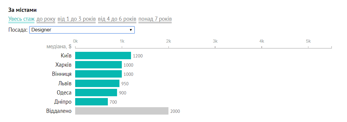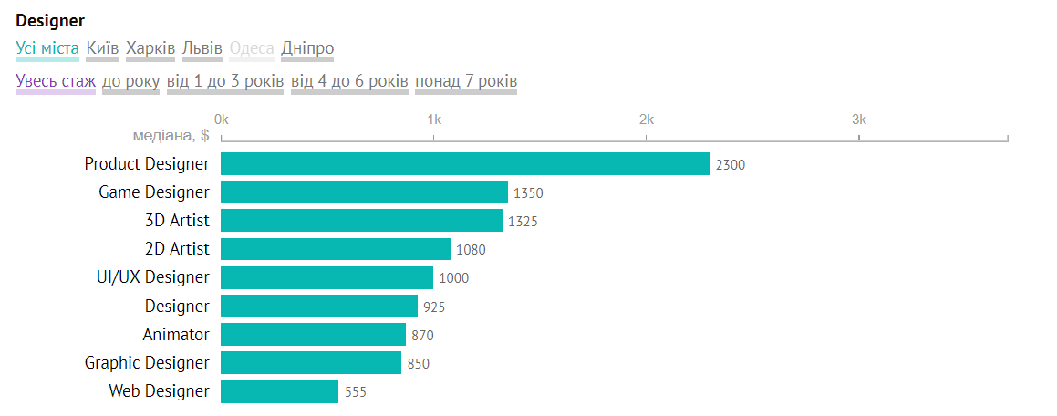 Найвища середня зарплата у Product-дизайнерів — $2300, а найнижча у Web-дизайнерів — $555. UX/UI спеціалісти-початківці мають медіану — $500, а ось середня зарплата досвідчених спеціалістів із досвідом понад 7 років — $2300.