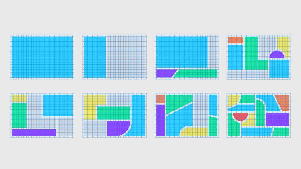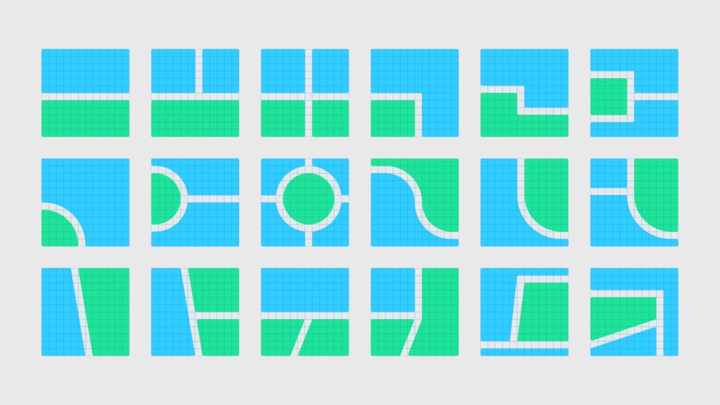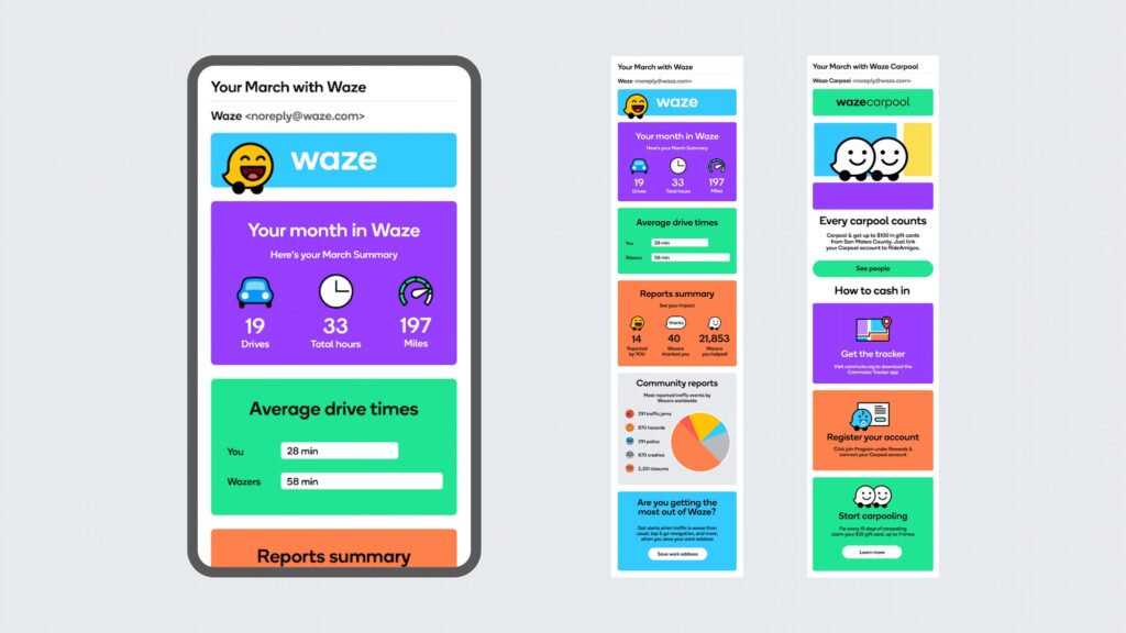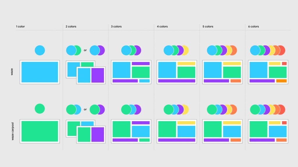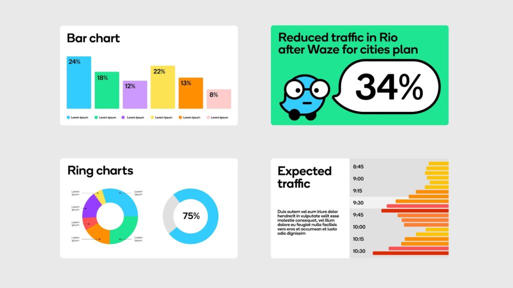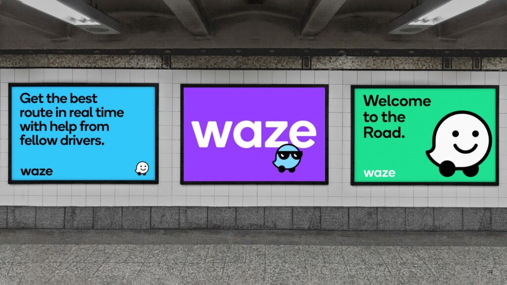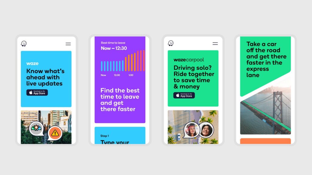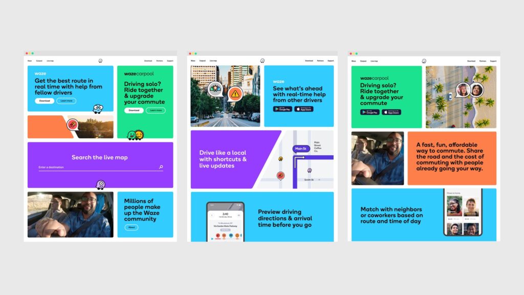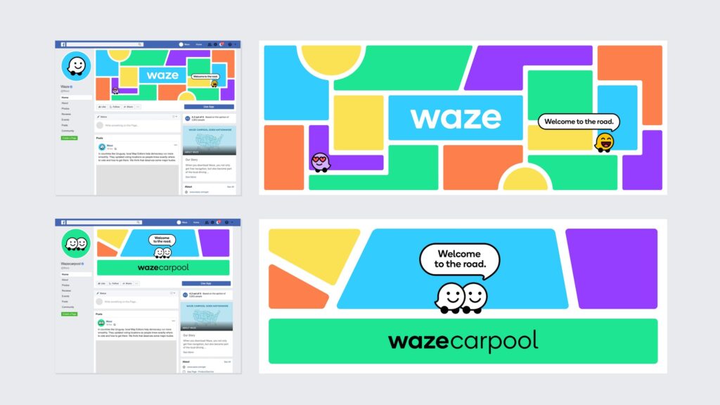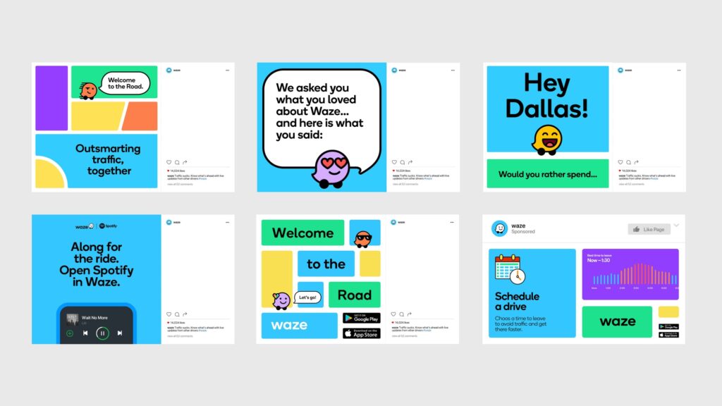 Всі елементи айдентики будуються в одній геометричній сітці – це створює міцну й одночасно гнучку основу, яка забезпечує консистентність бренду. І лого, і символ Wazer, і всі інші ключові елементи (Moods, хмаринки для спілкування, іконки продукту) були створені на основі цієї сітки. Система будується навколо мінімалістичного інтерфейсу Waze, до якого додаються кольори та чисті лінії. Сітка оживає і організовує інформацію в кольорові блоки. Вона формує легко впізнаваний світ Waze, незалежно від контексту: в додатку, вебсайті, у соцмережах чи імейл-розсилках.