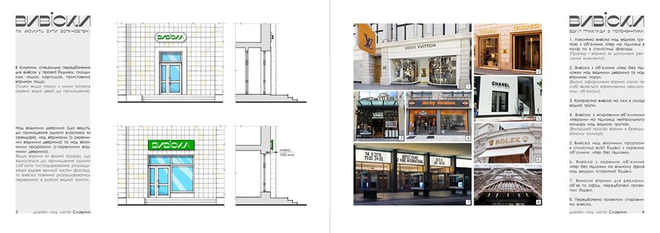Зараз вже можна подивитися один з розворотів майбутнього дизайн-коду. Це поки робочий варіант, тому автор просить не звертати увагу на орфографію і деякі приклади. Але в загальному по кожному типу зовнішньої реклами виглядати це буде приблизно так: