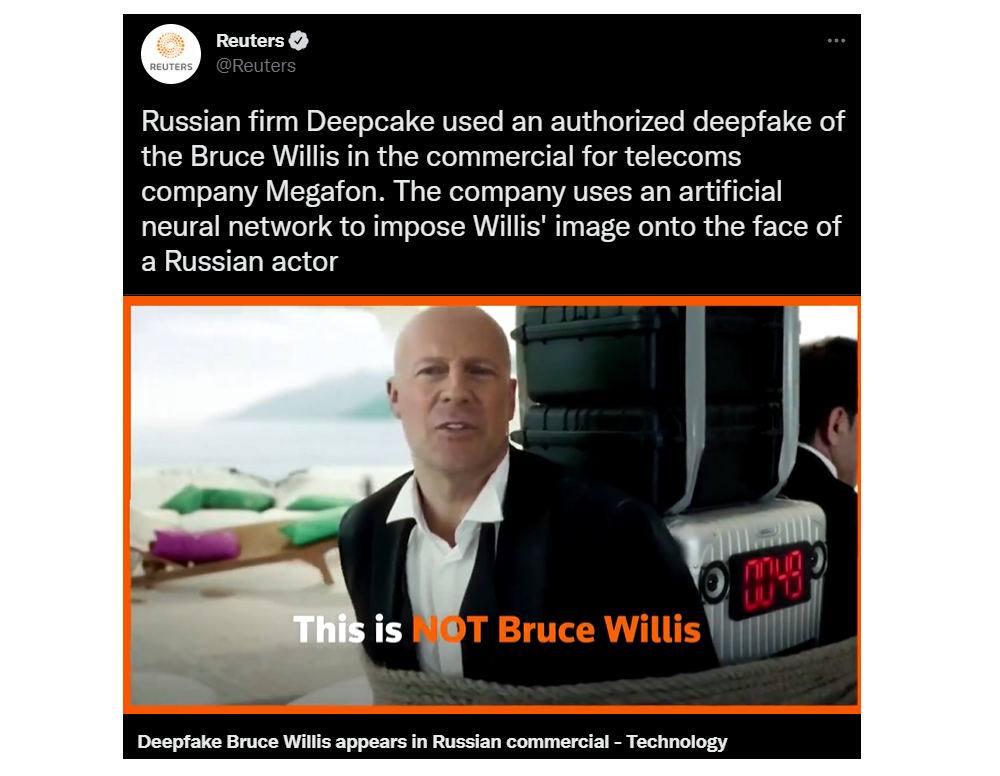 За тиждень до цієї події спочатку таблоїди, а потім і мейнстрімові медіа підхопили інформацію про те, що Брюс Вілліс продав права на використання своєї зовнішності, і що моляв, це перша угода такого типу. Зауважимо, що минулого року діпфейк-образ актора дійсно був у рекламі російської телекомунікаційної компанії «Мегафон».