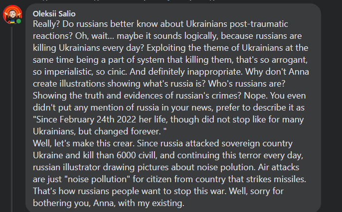 PS. Можливо, ви запитаєте, чому самі українці не подали роботи на цей конкурс, щоб розповісти свою історію – тож нагадаю, що через обстріли раші митці в Україні більшу частину доби не мають електроенергії. Дякую за увагу, сподіваюсь на розуміння”.