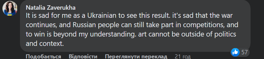 Мені, як українці, сумно бачити такий результат. Сумно, що війна продовжується, а росіяни можуть брати участь у змаганнях, а ще й перемагати. Це за межами мого розуміння. Мистецтво не може бути поза політикою та контекстом.