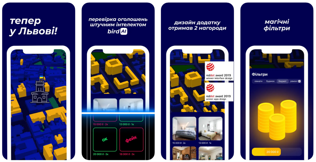 Bird — перший додаток для пошуку оренди квартир зі штучним інтелектом. До 2022 року працював виключно в Києві. Наразі має 230 000 користувачів у App Store із рейтингом додатка 4.9 балів. Цього року сервіс розширив свою географію і запустив додаток birb у Лондоні.