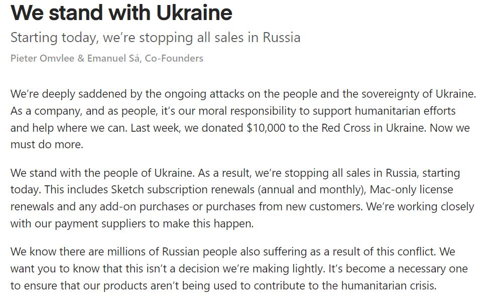 «Ми разом з народом України. Тож ми припиняємо всі продажі в Росії, відсьогодні. Сюди входить поновлення підписок на Sketch (річних та місячних), поновлення ліцензії лише для Mac, а також будь-які додаткові покупки або покупки від нових клієнтів. Ми тісно співпрацюємо з нашими постачальниками платежів, щоб це сталося».