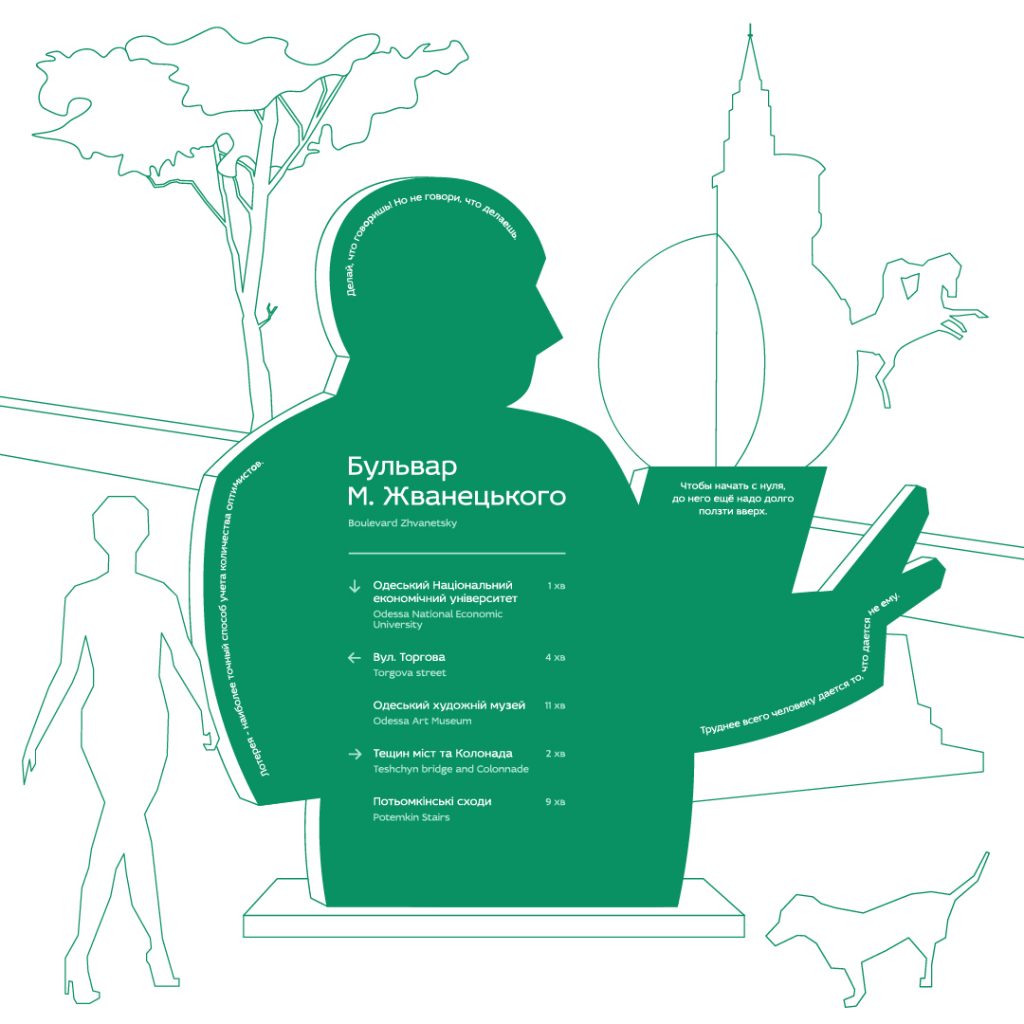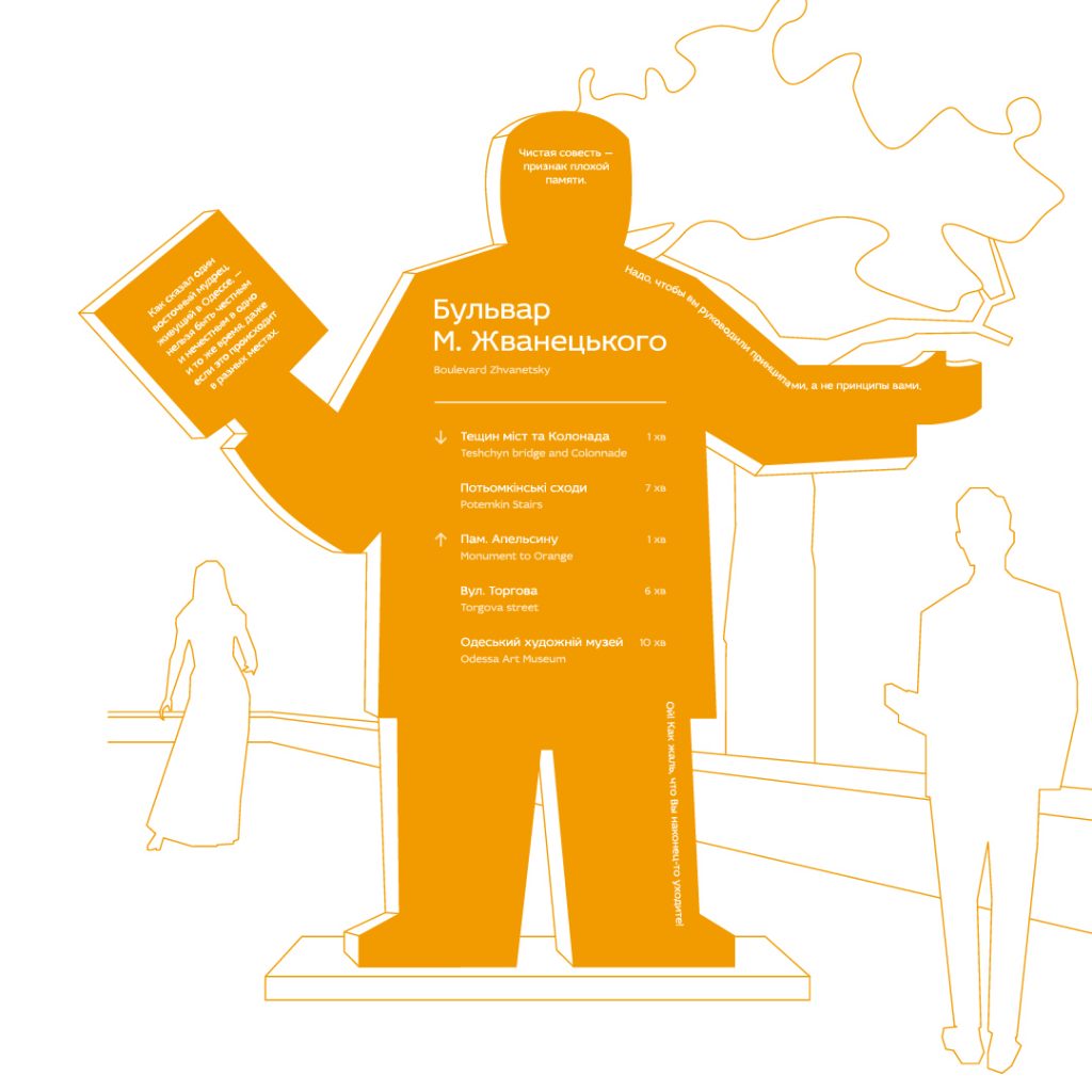 Дизайнери впевнені, що навіть бульвар може бути креативним. Вони розробили навігаційні стели, які мають вигляд силуету сатирика Жванецького, які встановлюються в головних містах бульвару.