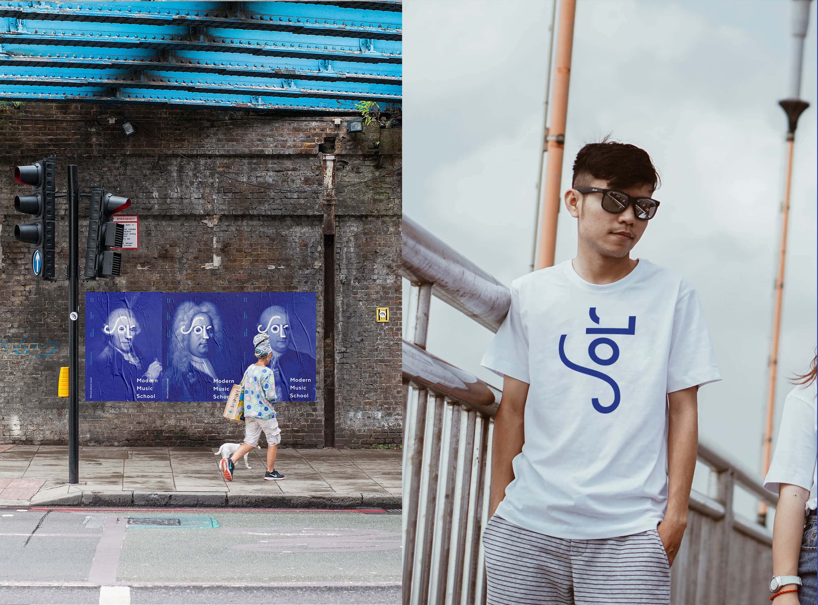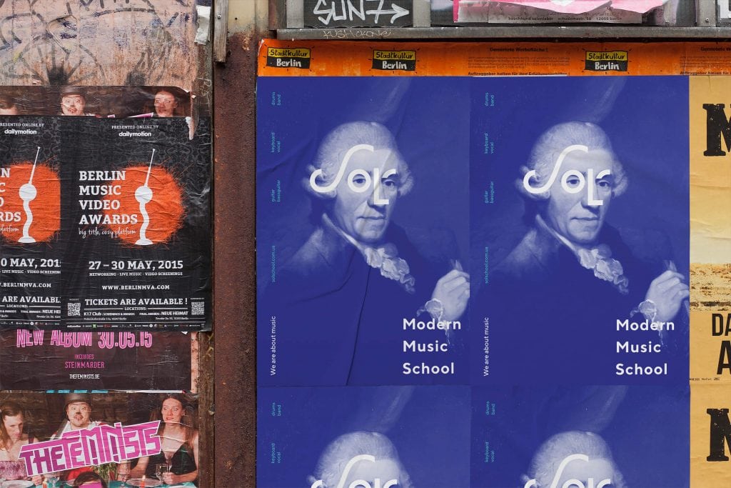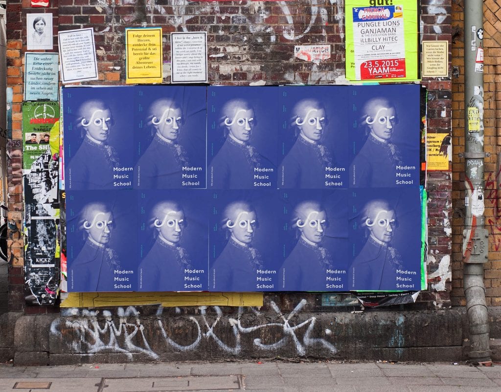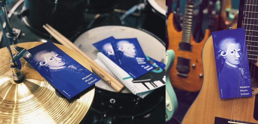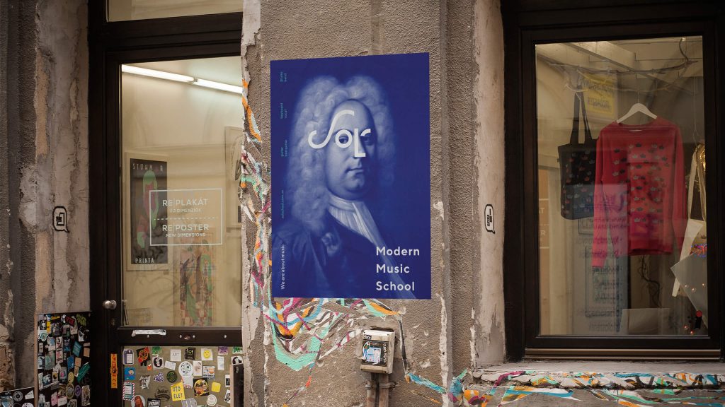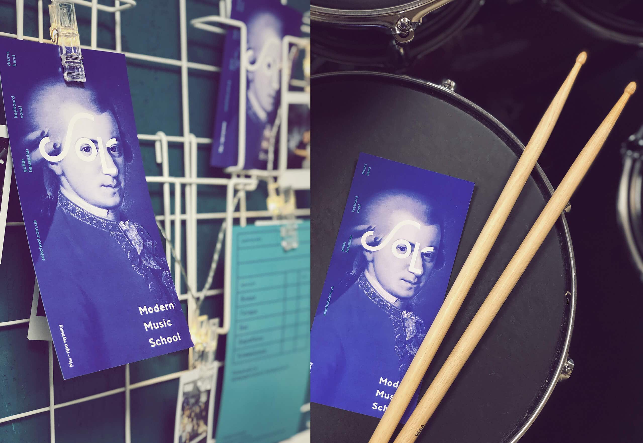 В основі дизайну лежать зображення назви школи, яке наклали на класичні портрети знаменитих музикантів.