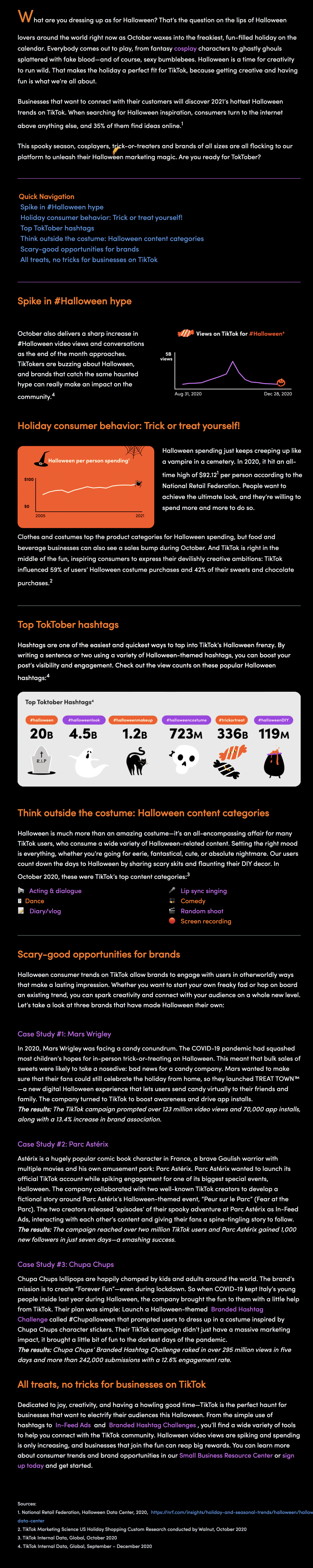 У жовтні різко зростає кількість переглядів відео та згадок #Halloween. «Серед тіктокерів йде поголос про свято, й бренди, що будуть на хвилі хайпу з привидами, дійсно можуть вплинути на спільноту», — зазначають у соцмережі.