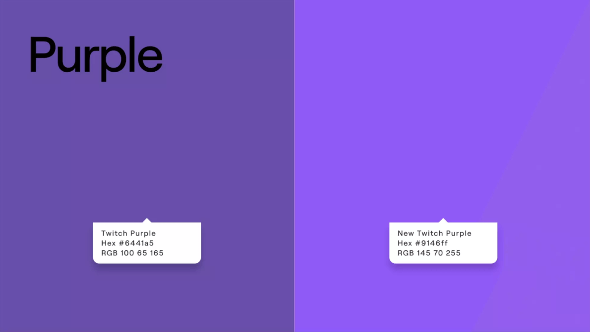 Змінилася кольорова палітра. Twitch добре відомий своєю улюбленою фіолетовою палітрою, тому дизайнери прагнули закріпити її шляхом накладення гнучкої системи яскравих відтінків. Це було зроблено для того, щоб продемонструвати зростаюче розмаїття талантів і аудиторії, які приєднуються до платформи.