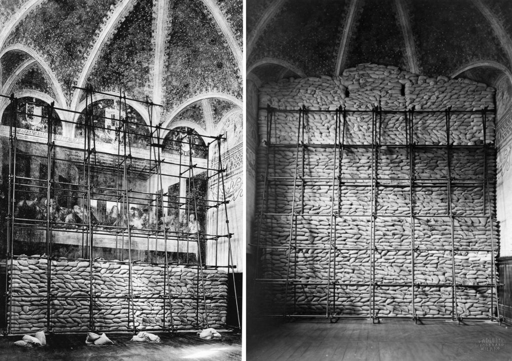 Якщо пам’ятник великий, внутрішній фасад огороджують сіткою рабіца, а простір між фанерою та сіткою заповнюють мішками з піском. Мішки з піском, здатні затримувати кулі та уламки, використовували з цією ж метою ще в часи Другої світової війни. Згори конструкцію закривають профлистом.