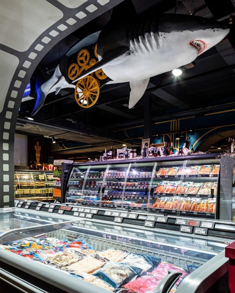 Над відділом риби розміщена декорація в дусі «Щелеп» ― механічна акула.