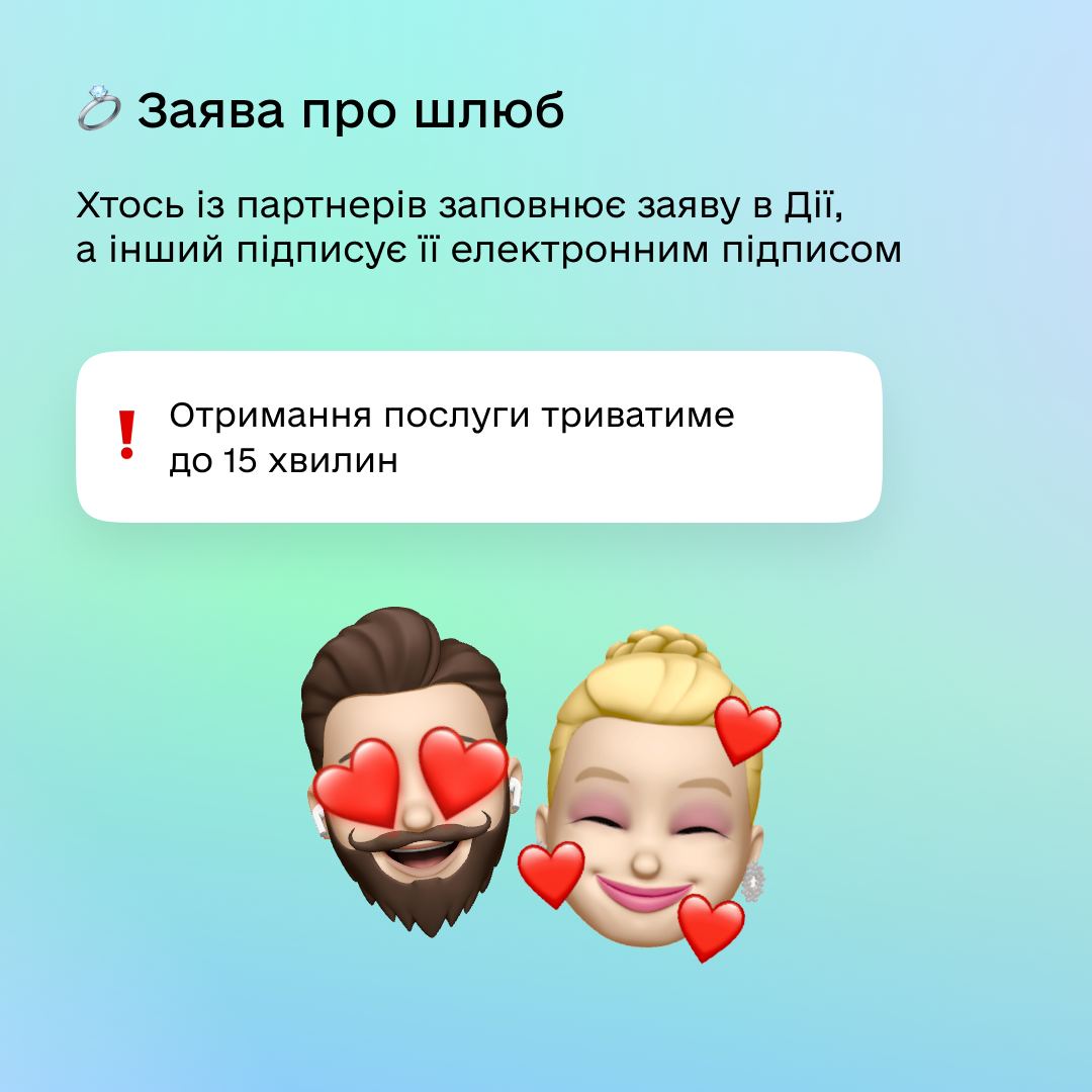 Отримання послуги триватиме до 15 хвилин. Хтось один із партнерів може заповнити заяву в Дії, а інший підписати її електронним підписом. Тож без вашої згоди подати заяву на шлюб точно не вийде.