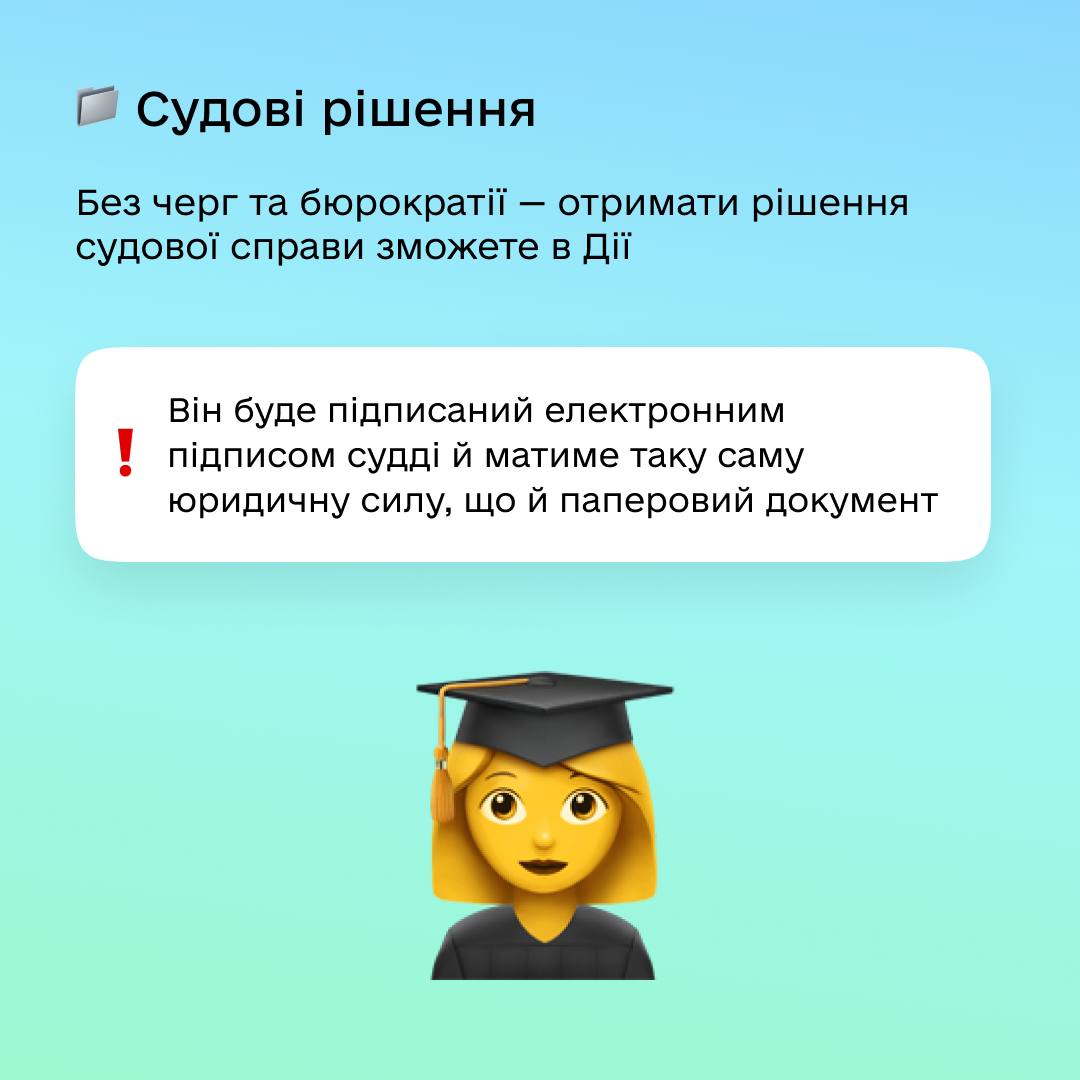 Не потрібно буде ходити до суду, щоб дізнатися рішення судової справи. Отримати відповідний документ можна в кілька кліків. До того ж він підписаний електронним підписом судді й має таку саму юридичну силу, що й паперовий документ.