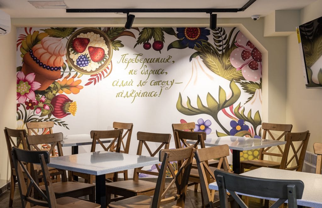 У композиції оформленій національним орнаментом обіграли історію продуктів. Стеля декорована плетеними кошиками та глечиками з кераміки, виготовленими вручну. Також за петриківськими традиціями розписана піч, в якій готується піца, і лайтбокси кас.
