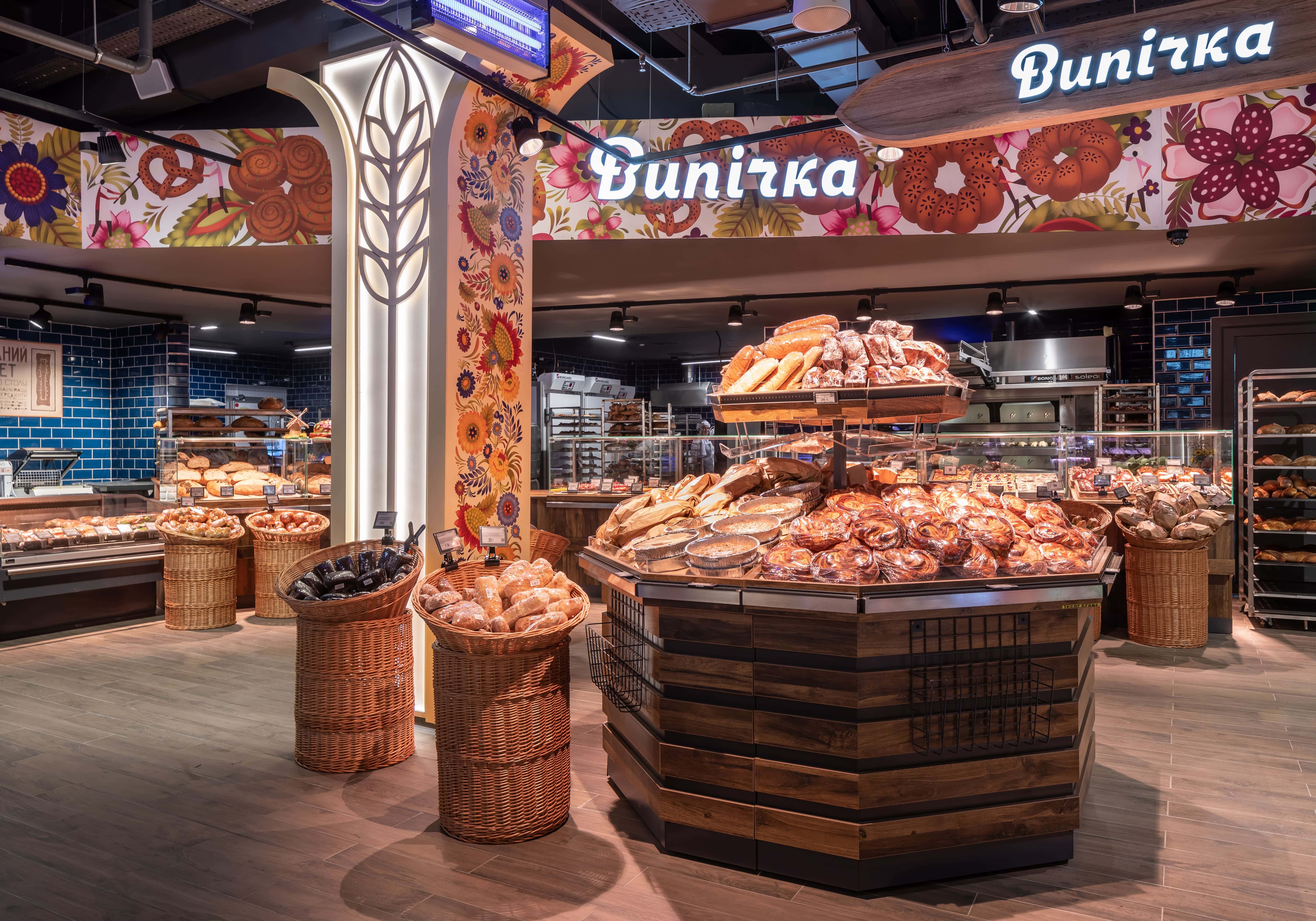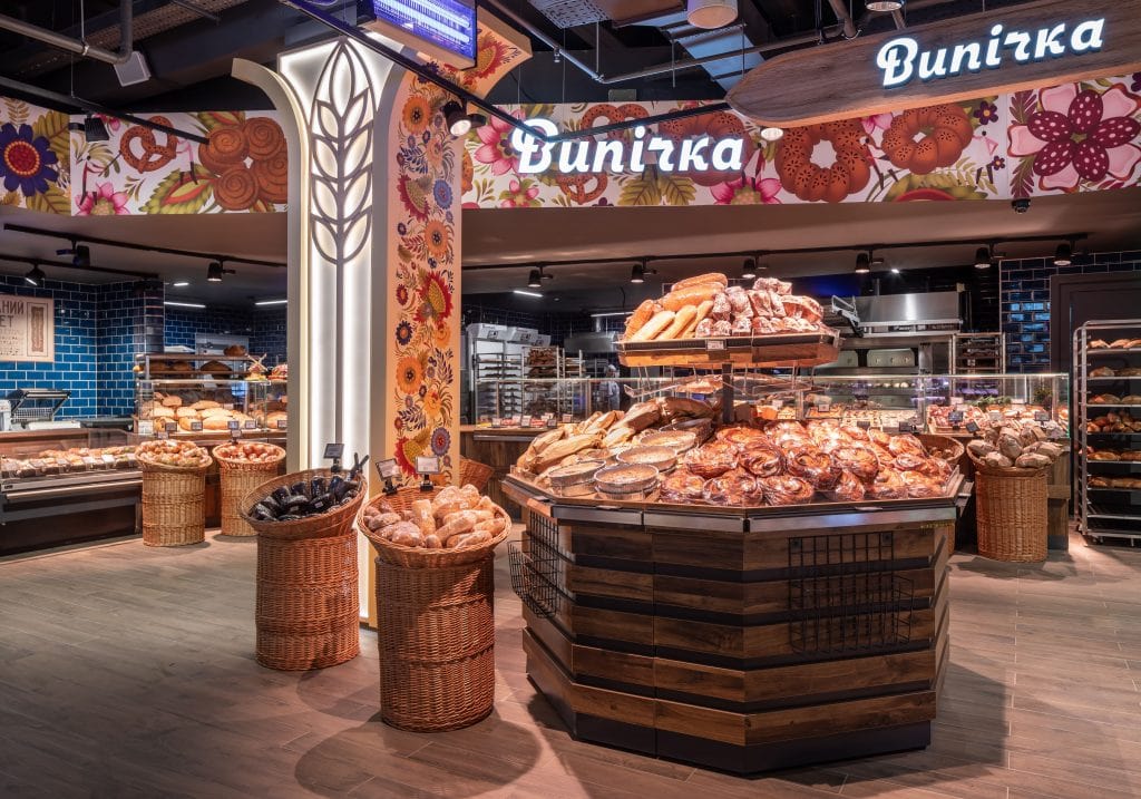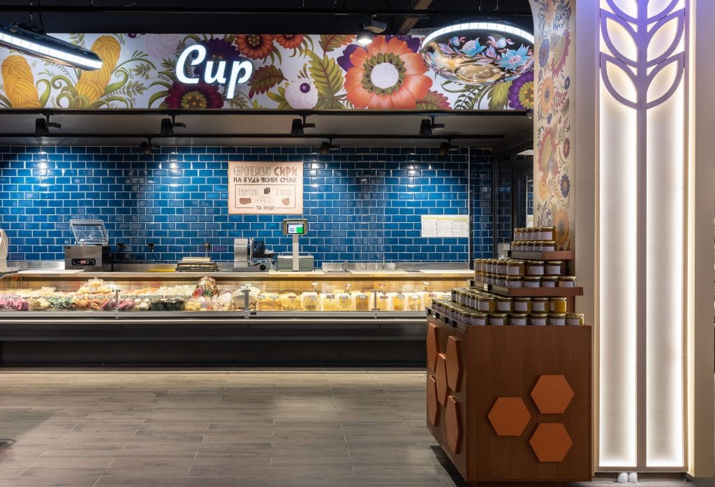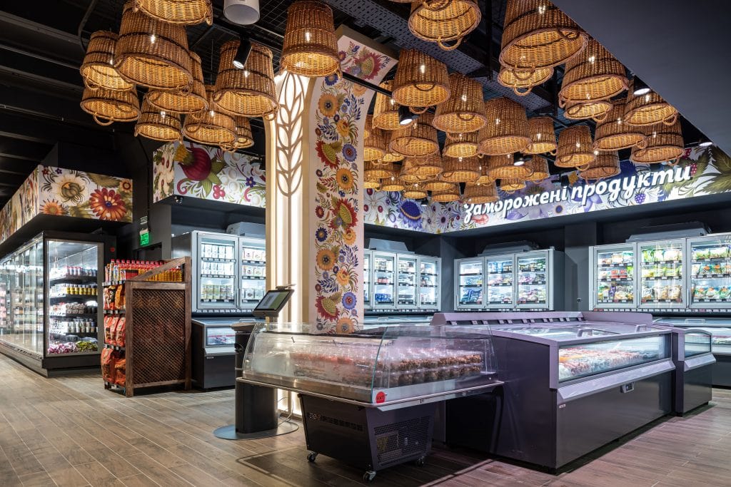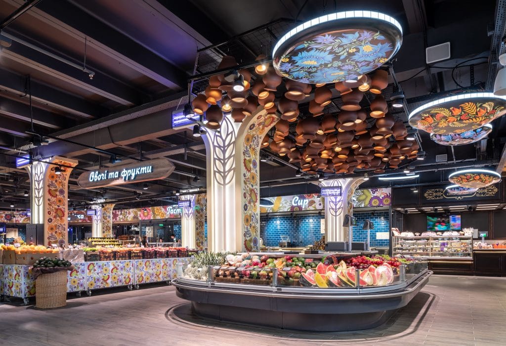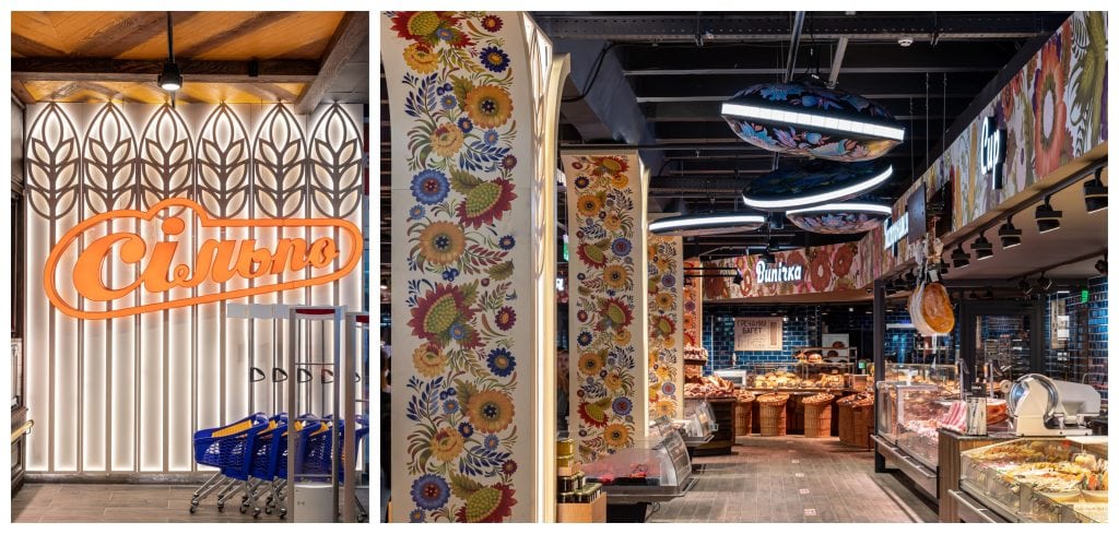 Петриківський розпис прикрашає стіни й колони магазину, тарілки і не лише кухонні, але й тарілки НЛО. Щоб зберегти автентичність візерунків і душевну пластичність знакової мови, торгову залу художники розписували вручну. Її загальна площа, за даними прес-служби мережі Сільпо, 1352 м2.